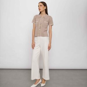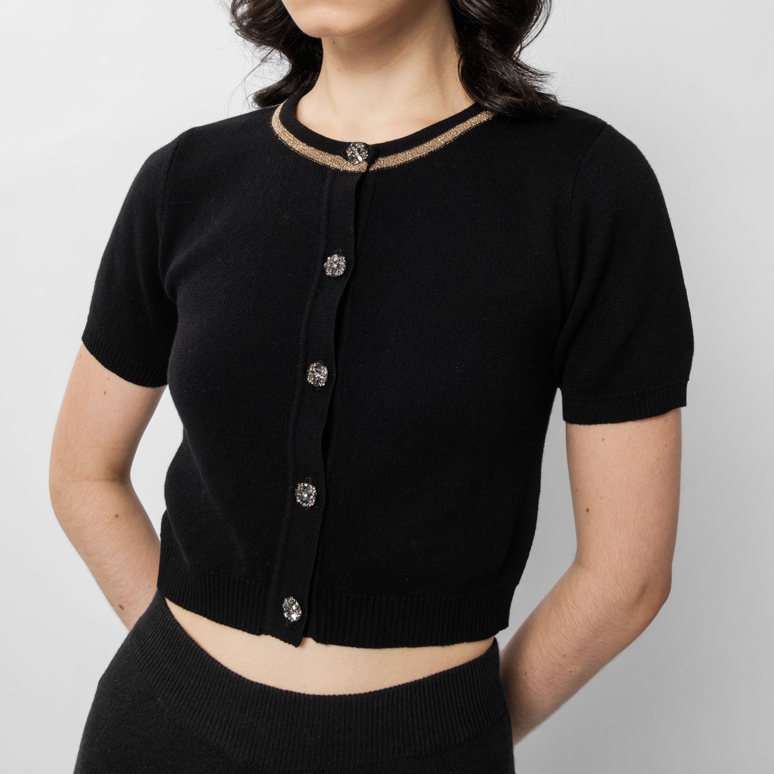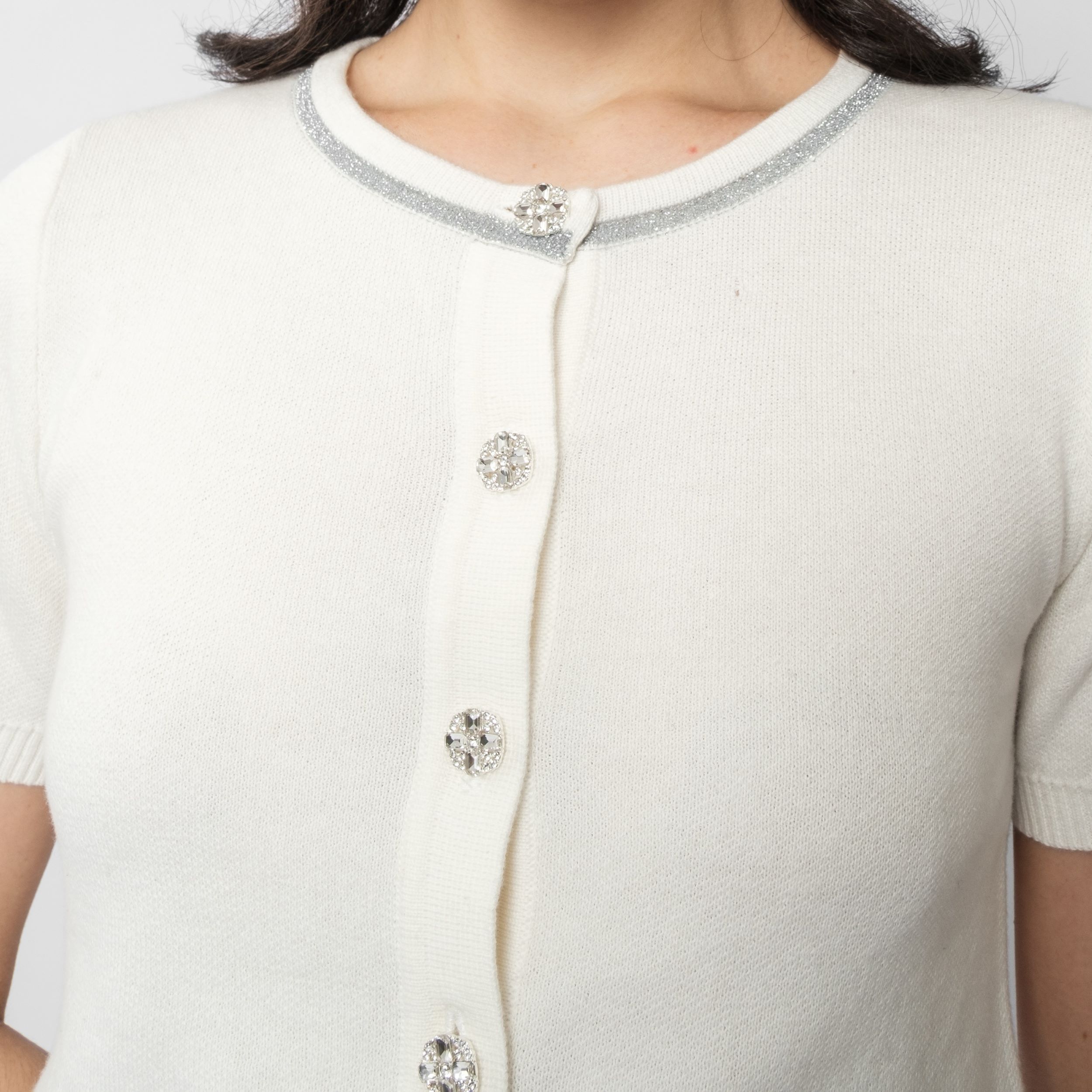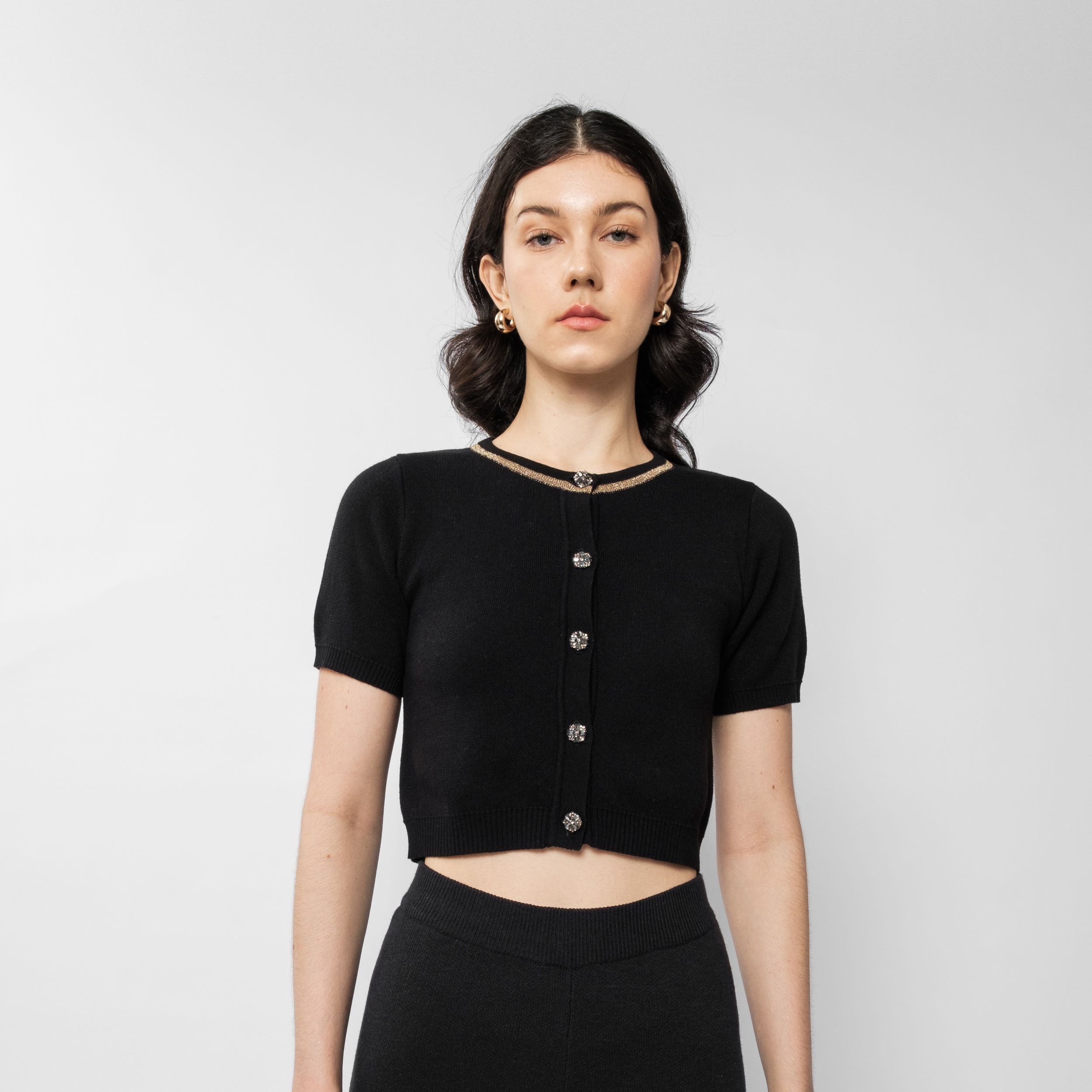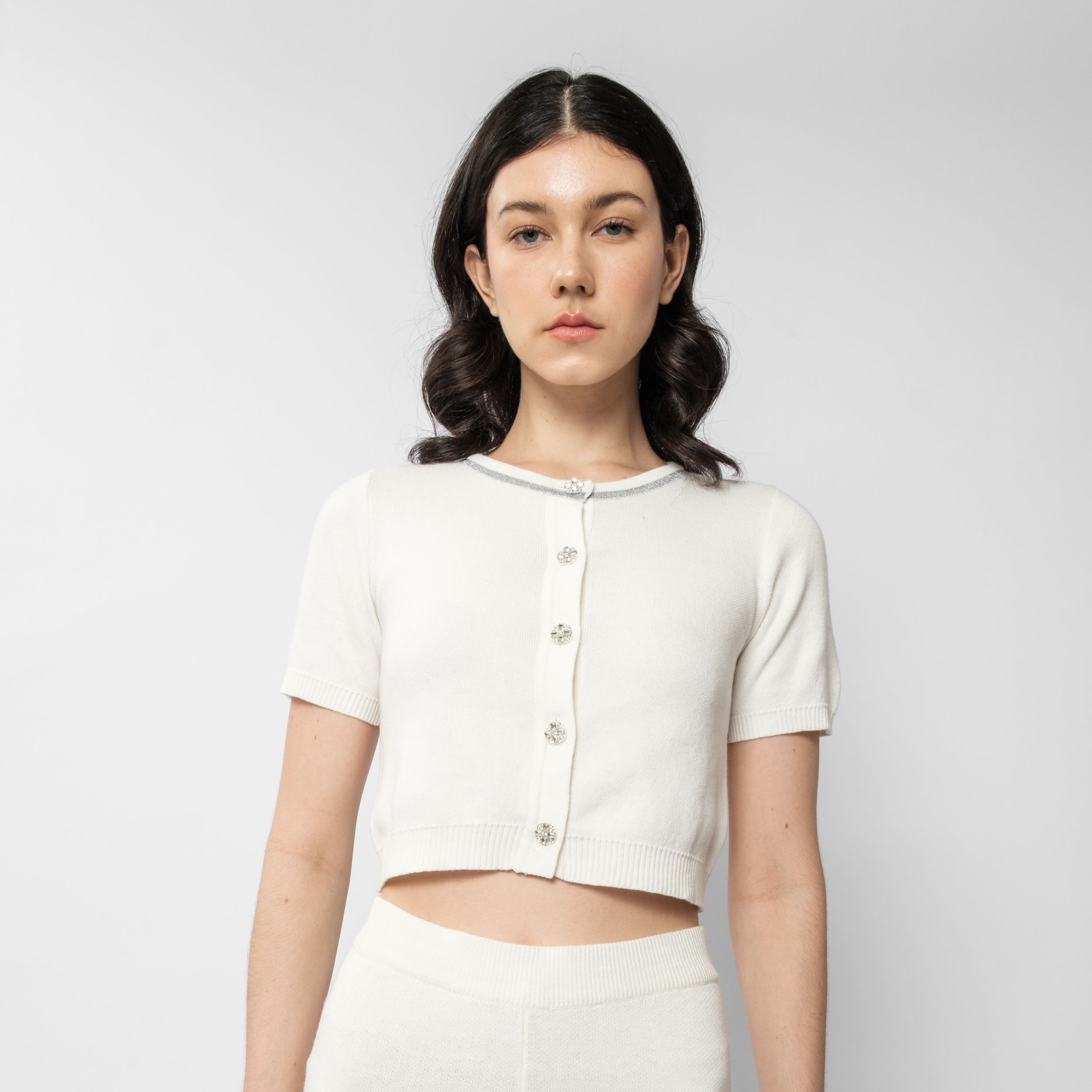 Cropped knit top with O-neck and details around it. Equipped with elegant buttons to add the top more in style.