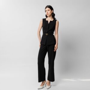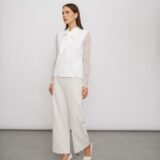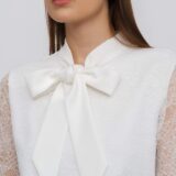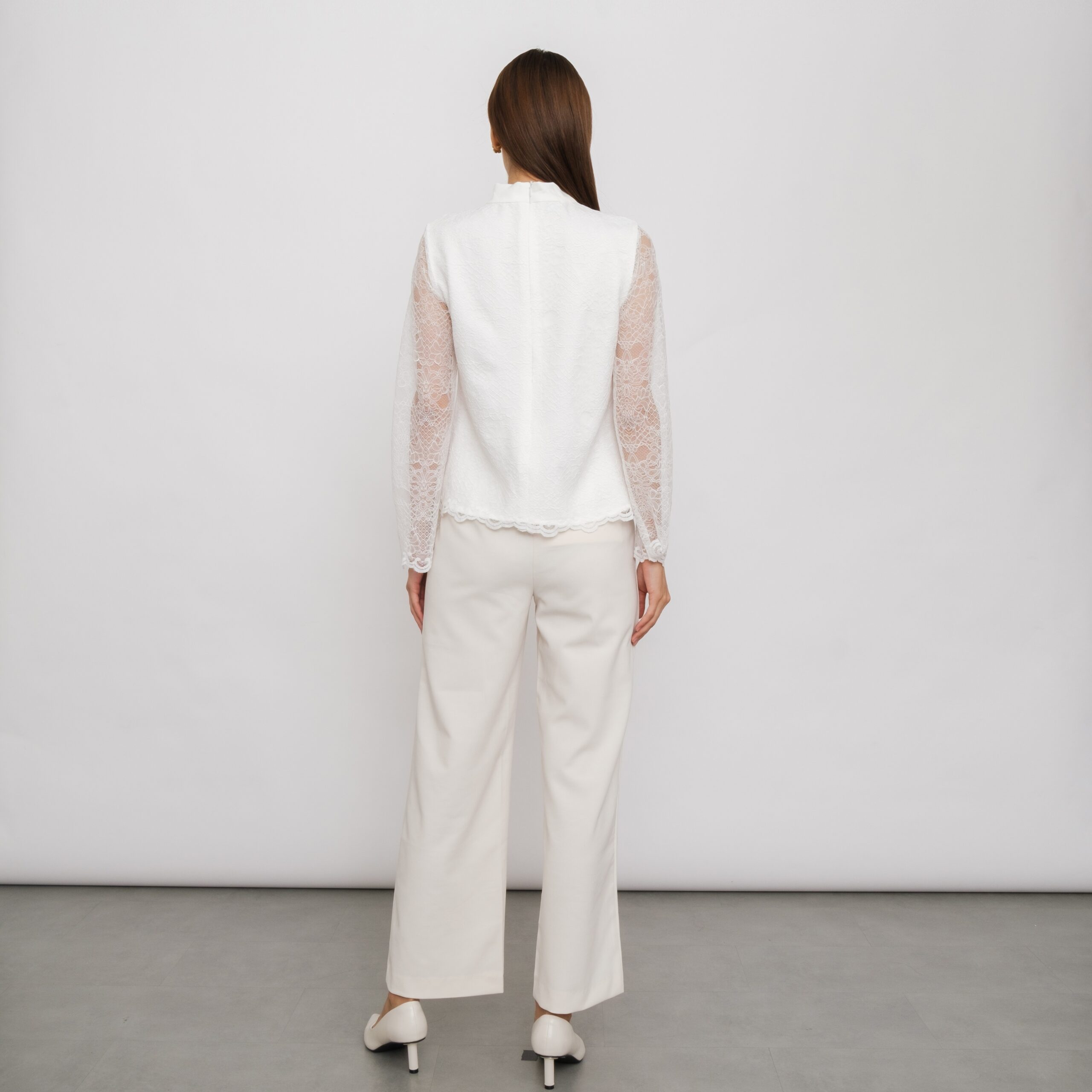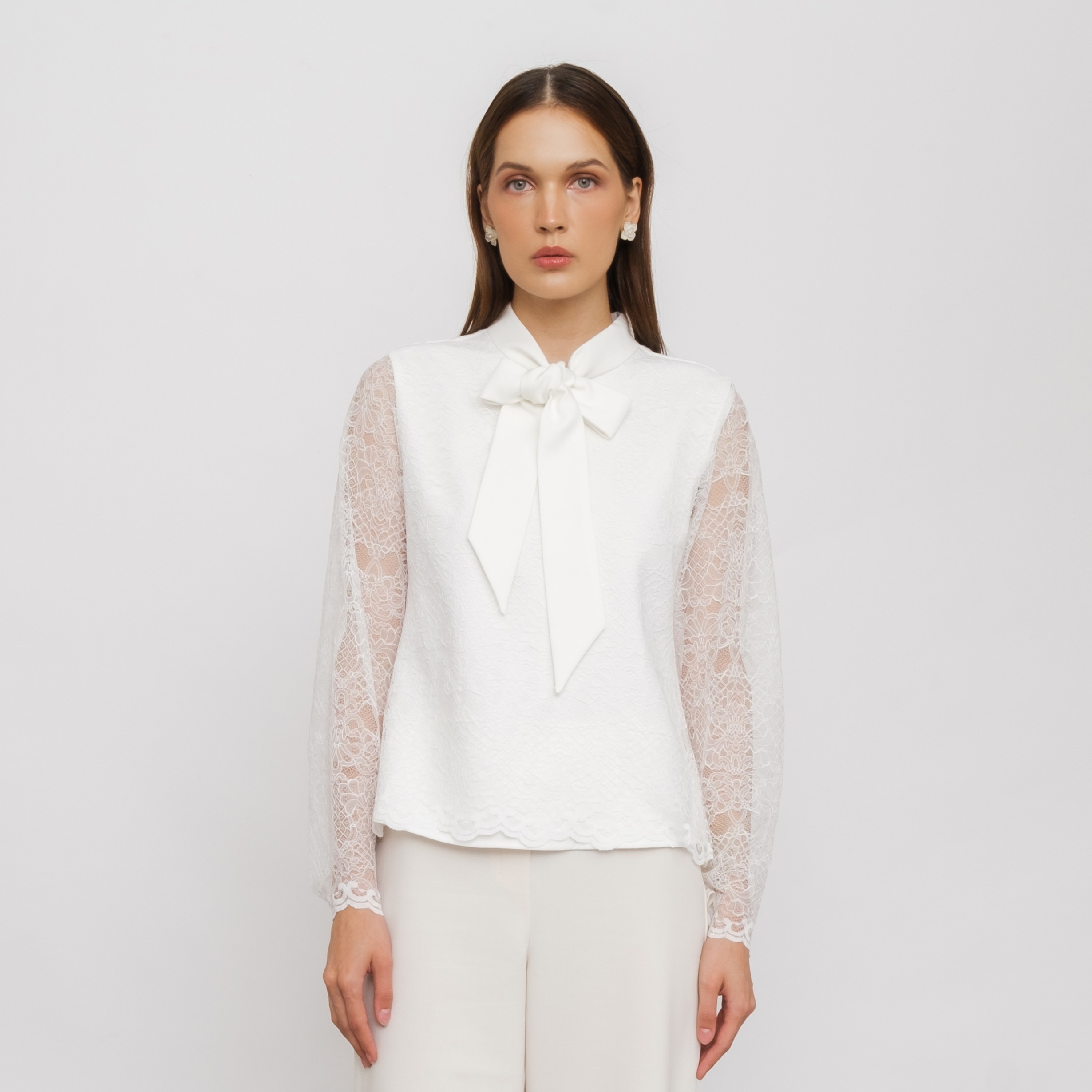 Long-sleeved blouse with lace sleeve and ribbon collar.