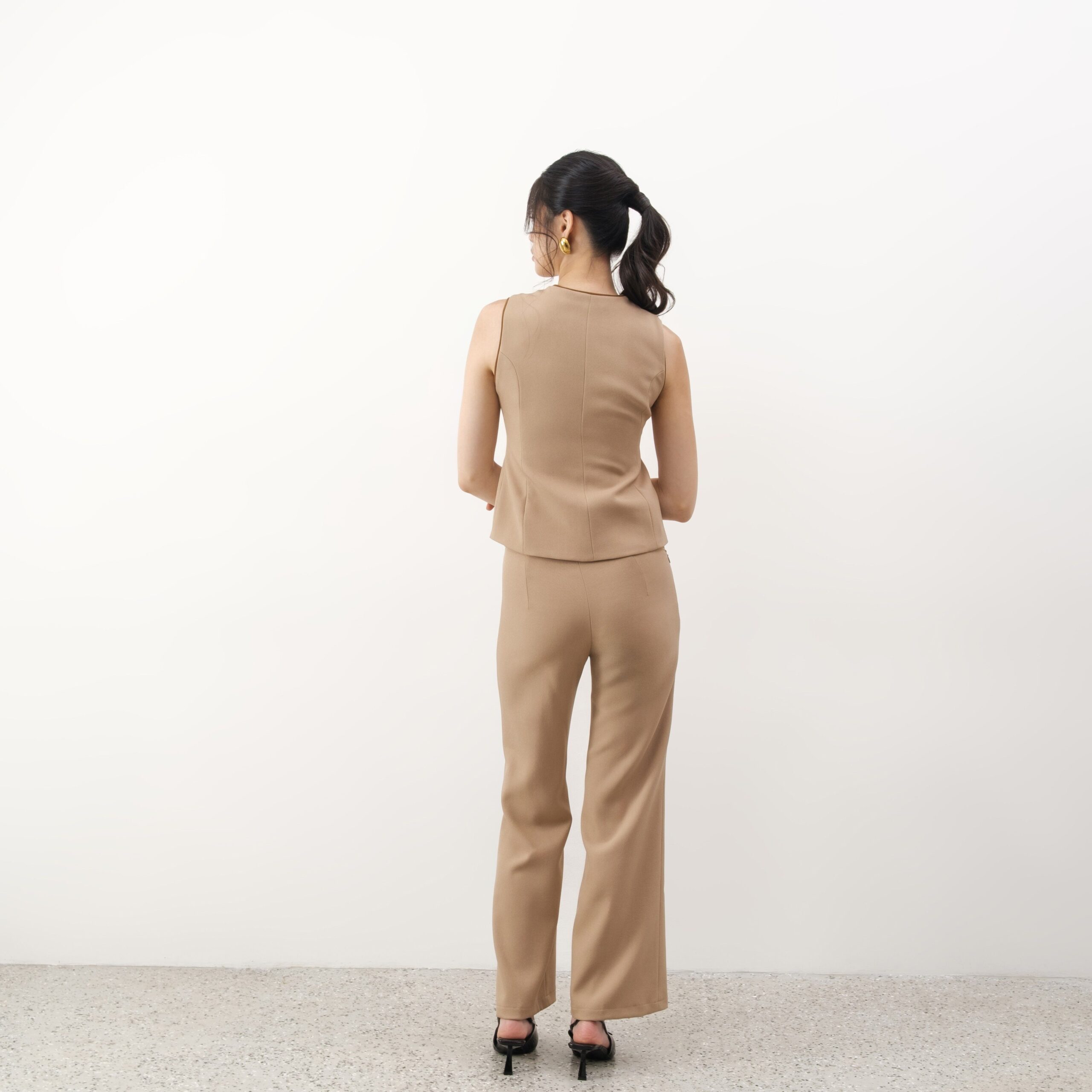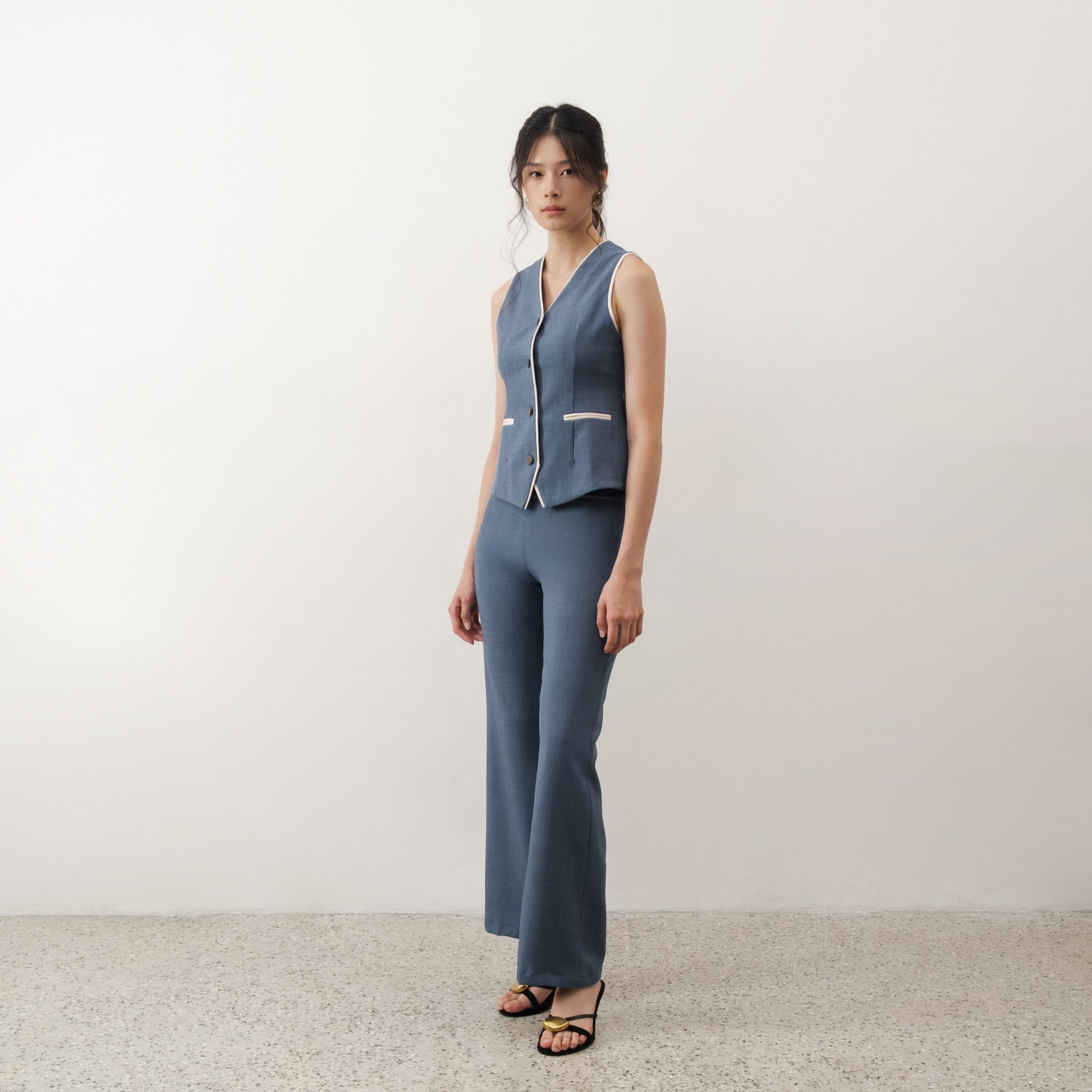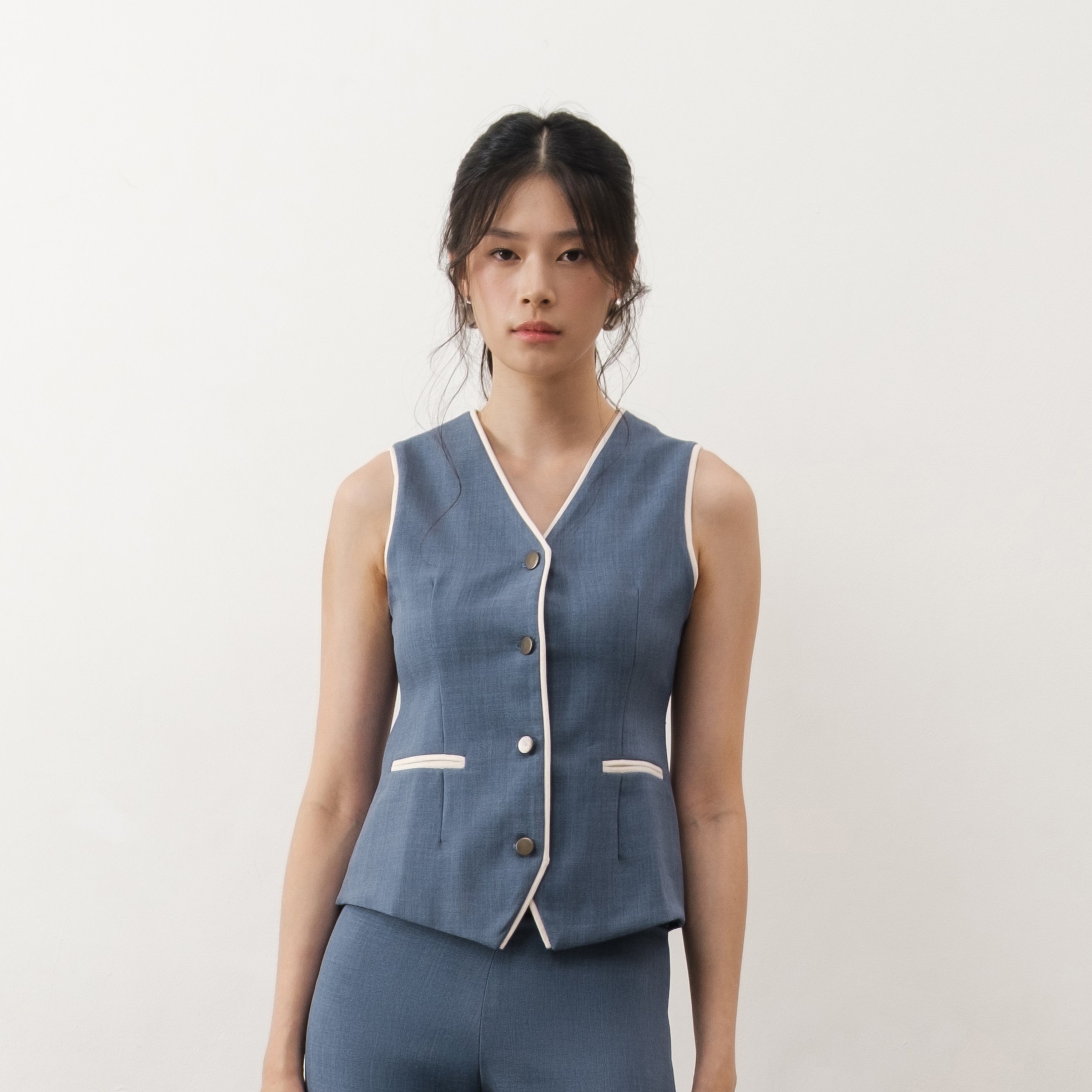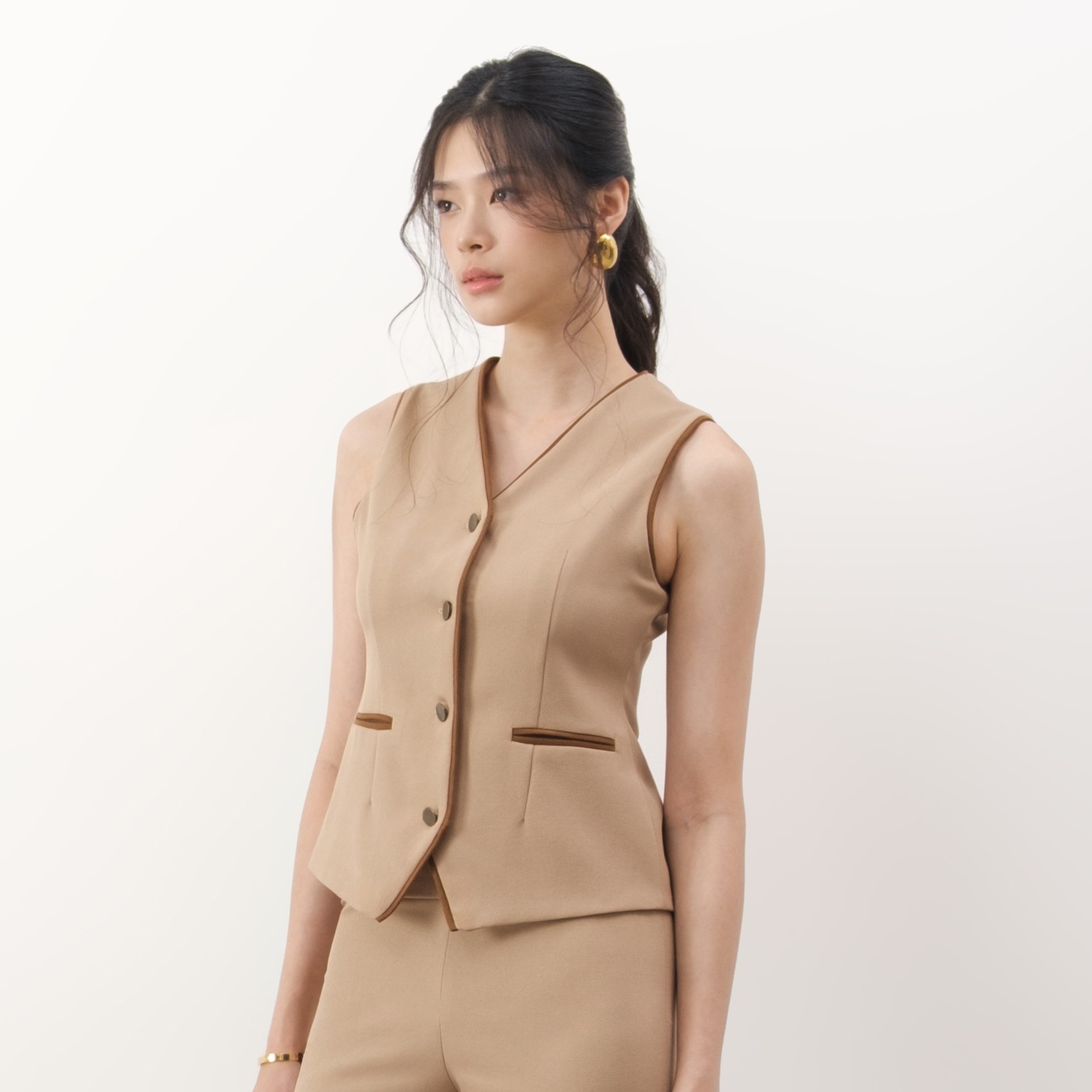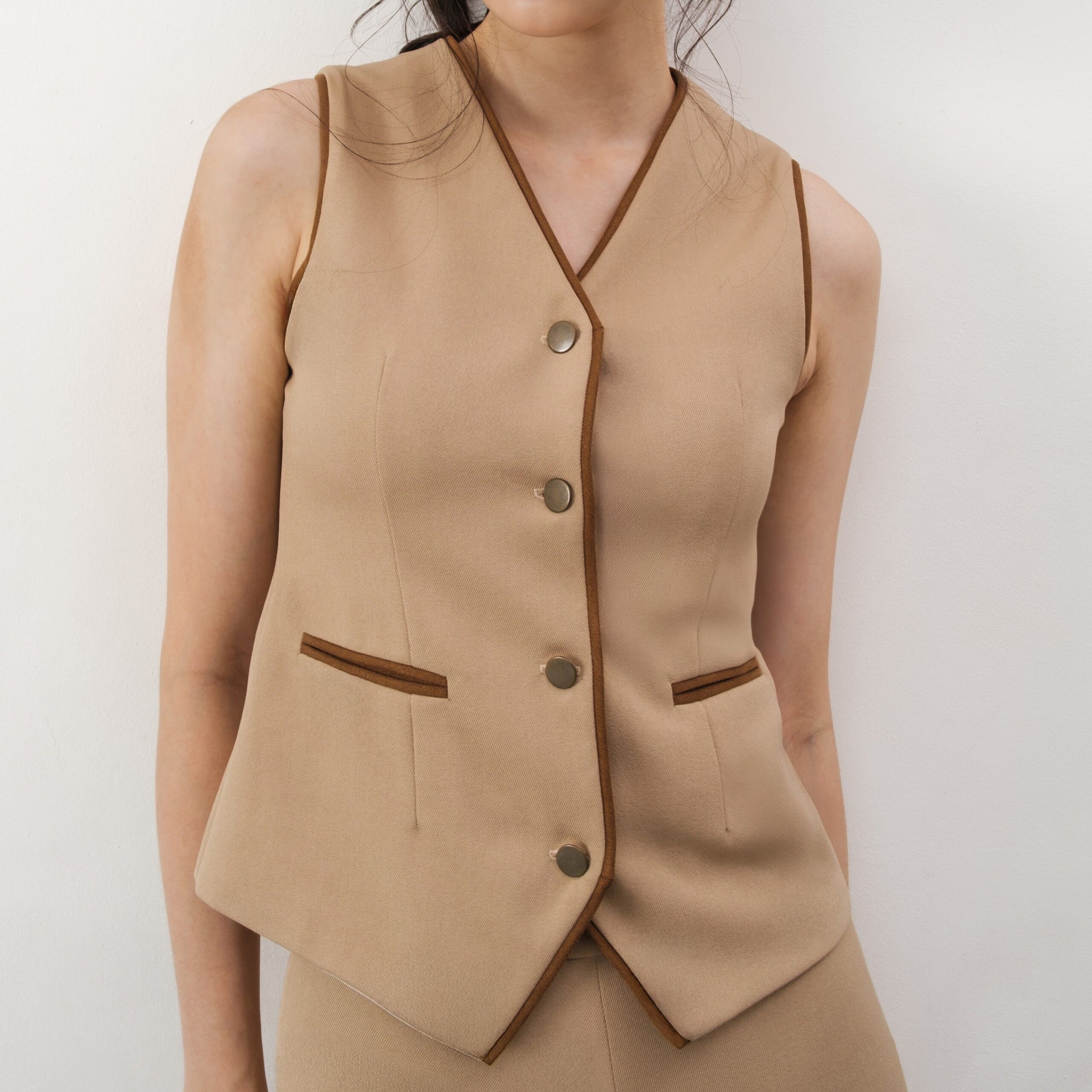 Tailored vest with a V-neckline, finished with contrast suede lining for a refined look. A polished, classy choice for any occasion.