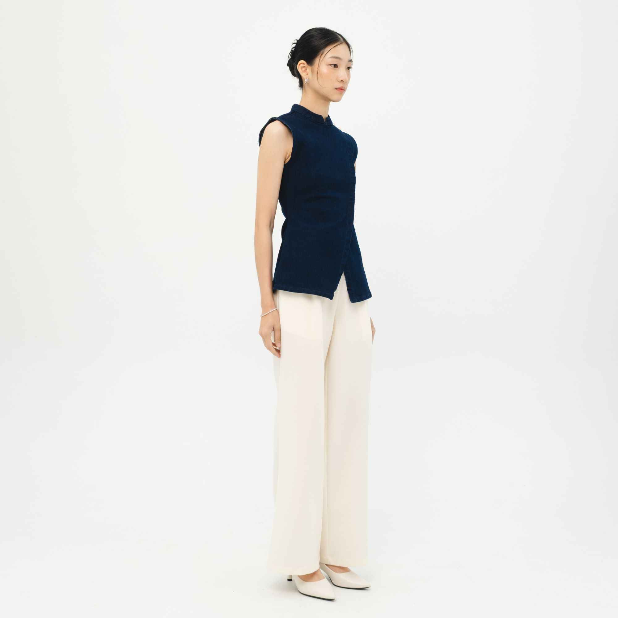 Sleeveless top with a high neckline, asymmetrical front design, and double gold accents. Stylish and elegant for any occasion.