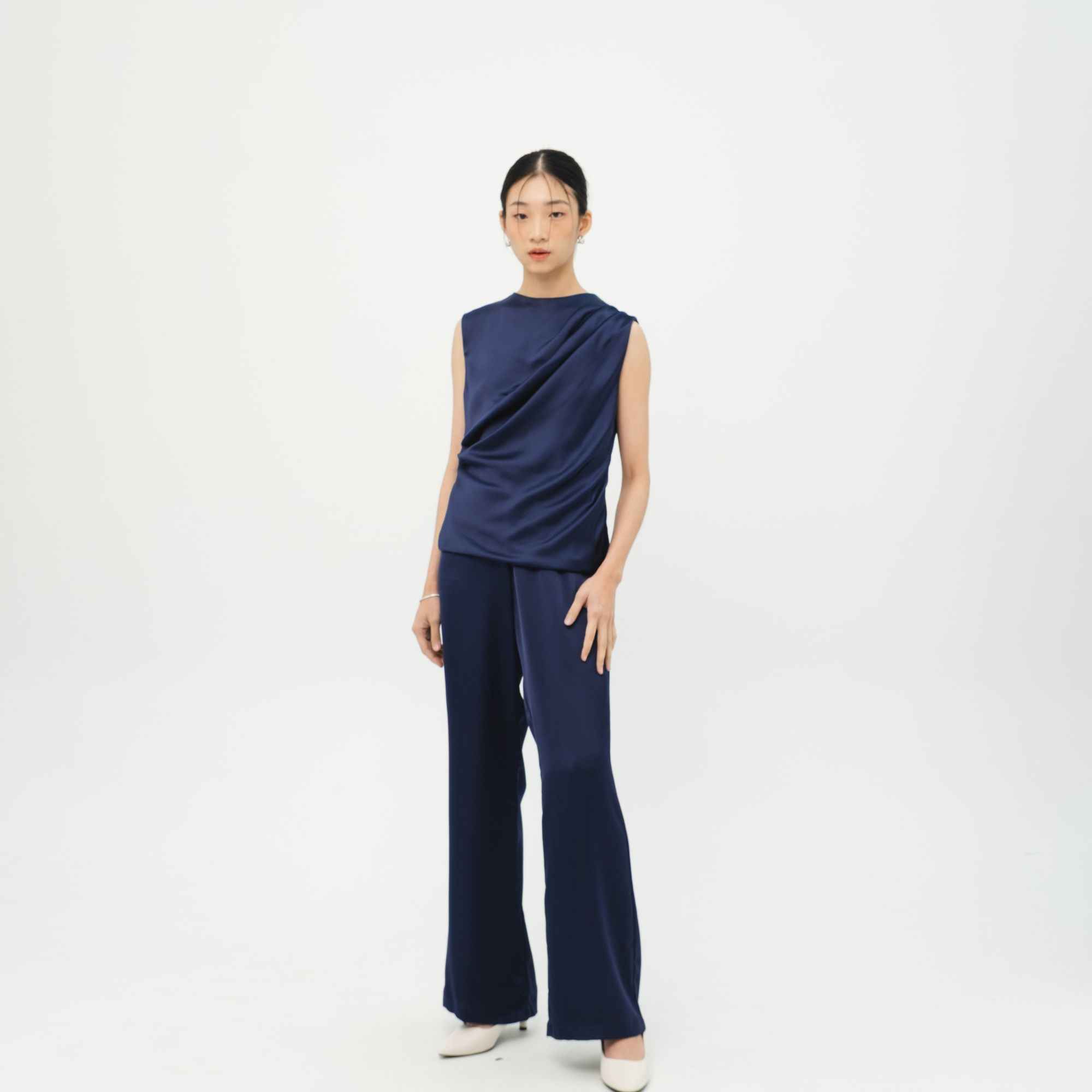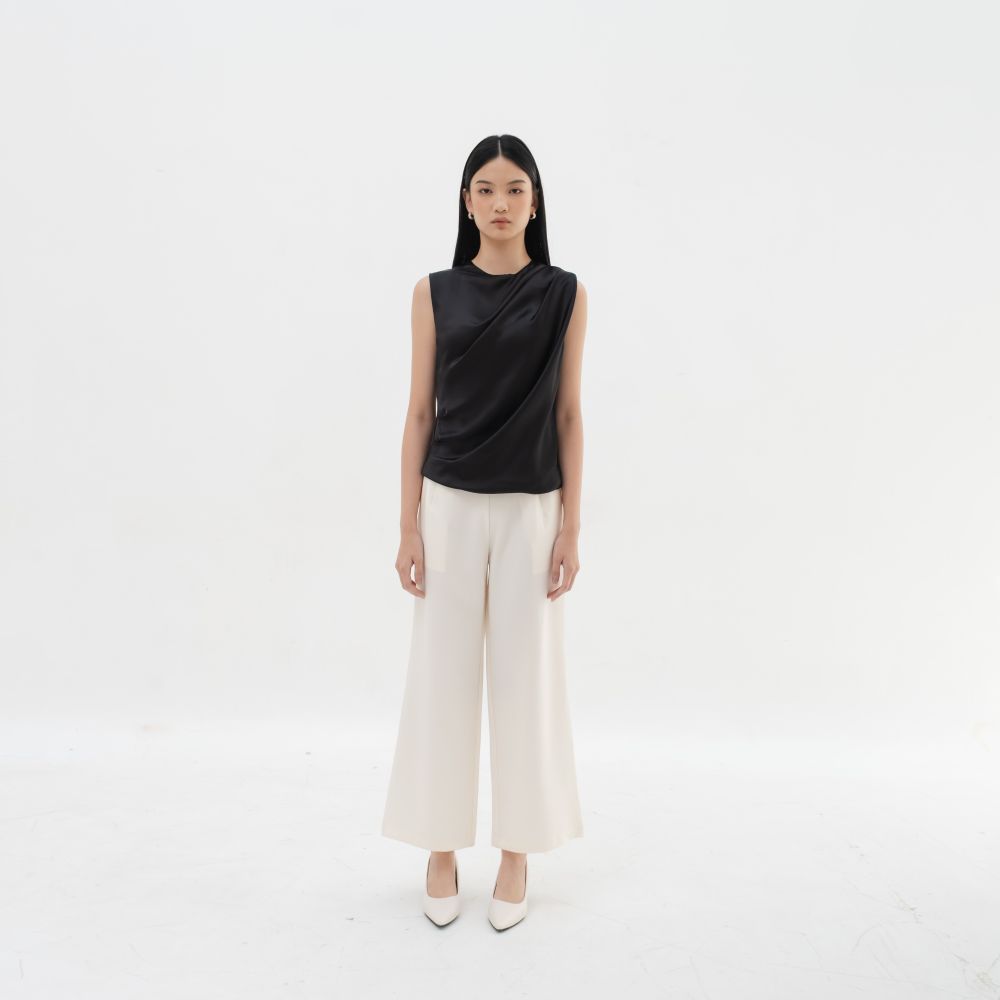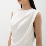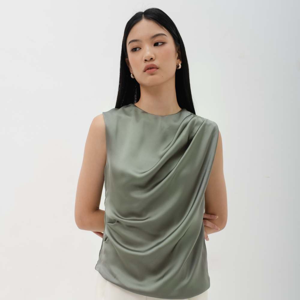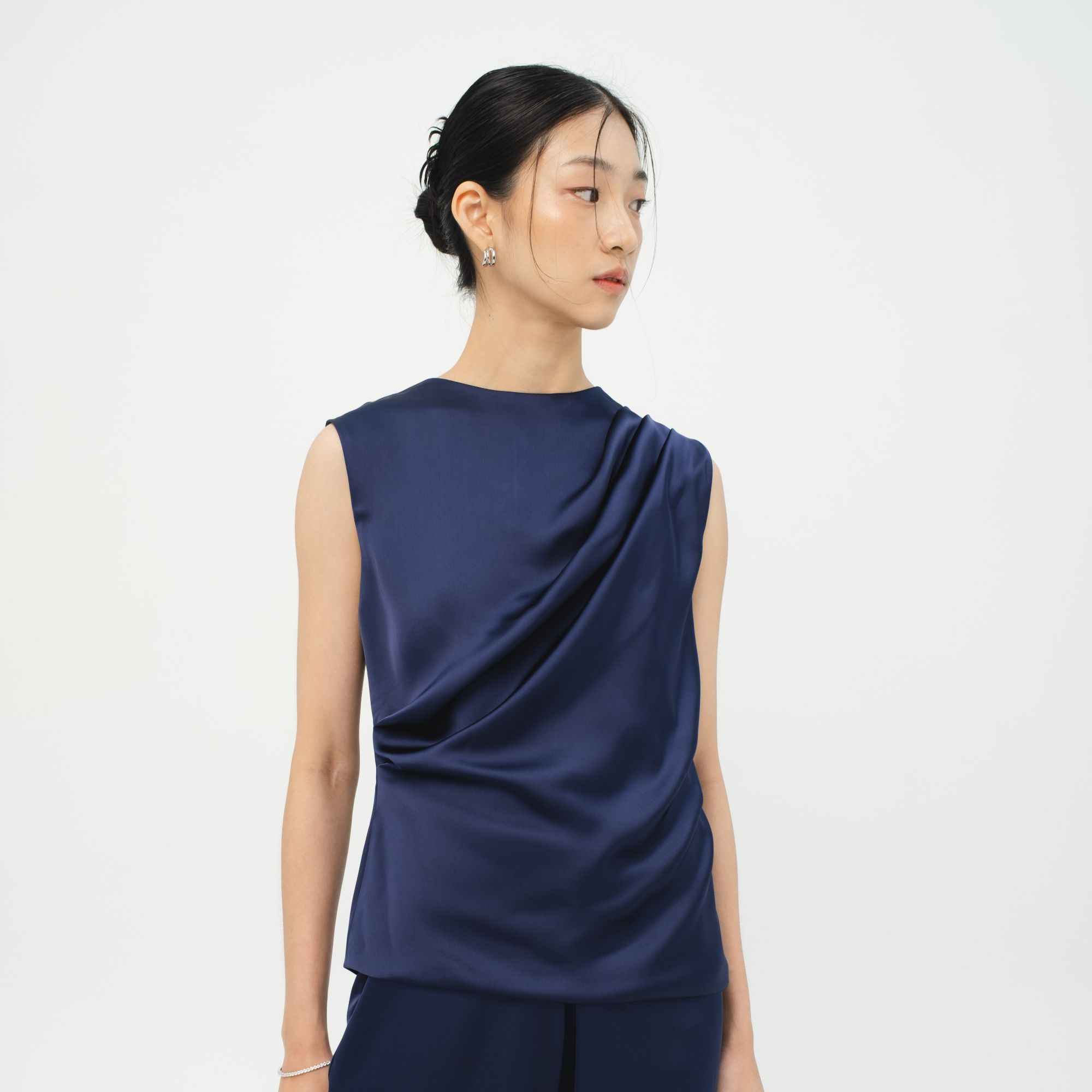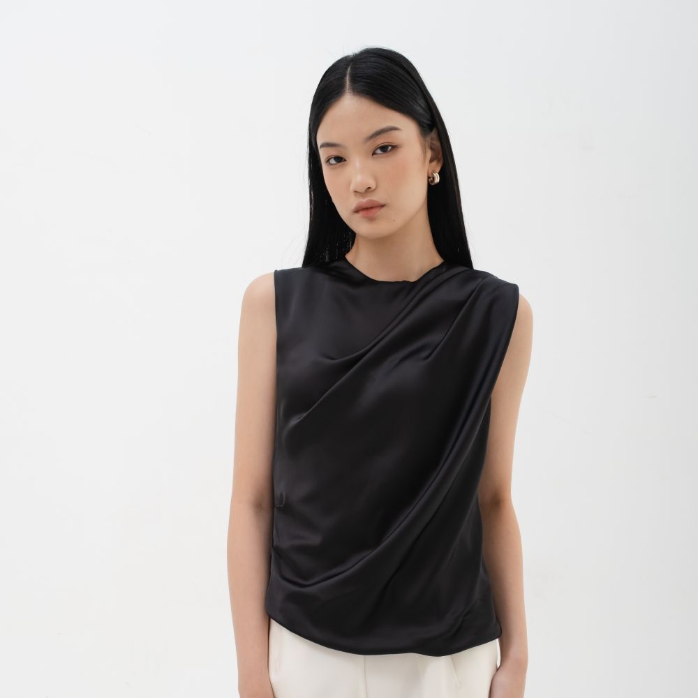 A sleeveless satin top with rippling, draped details. The smooth, luxurious satin fabric adds a touch of elegance.