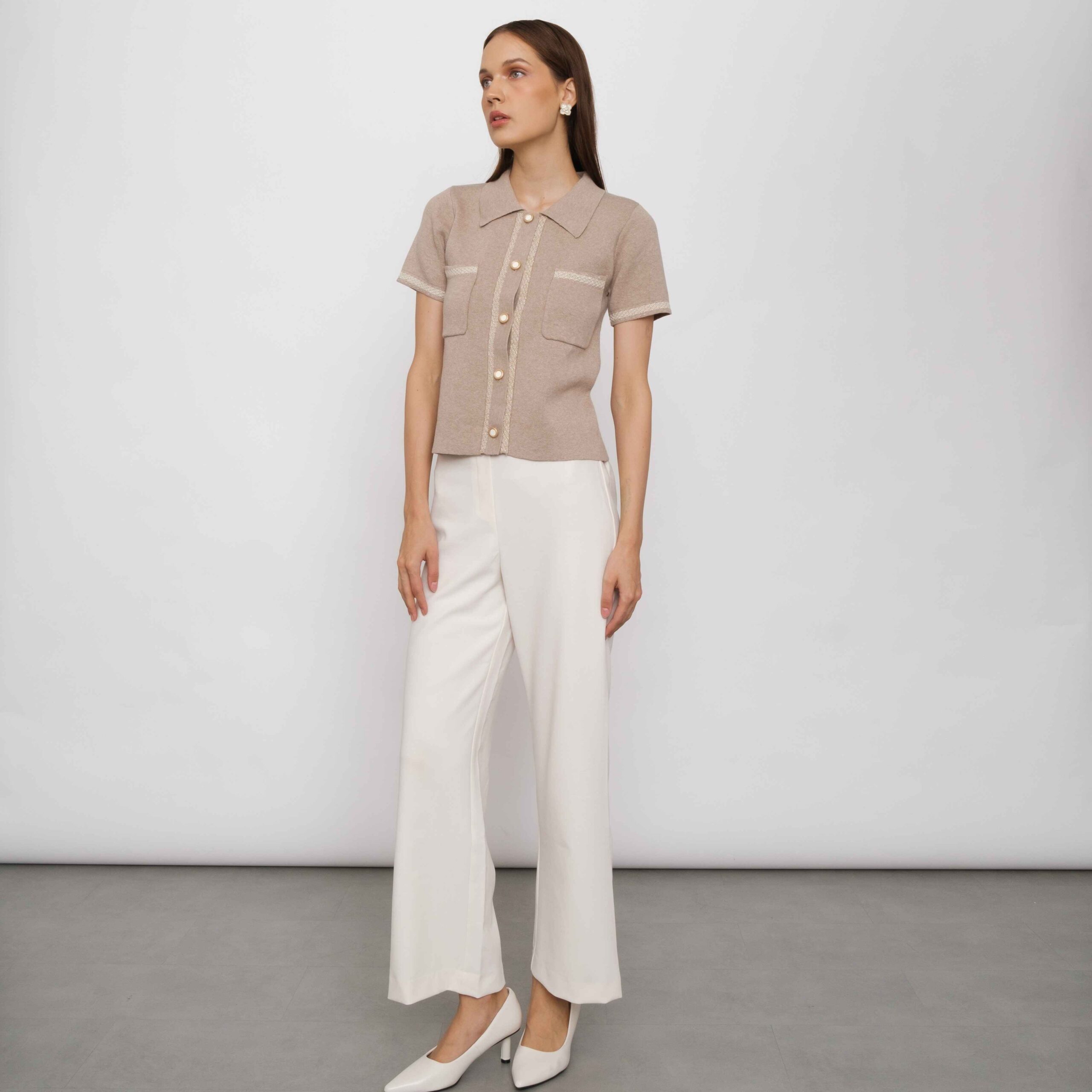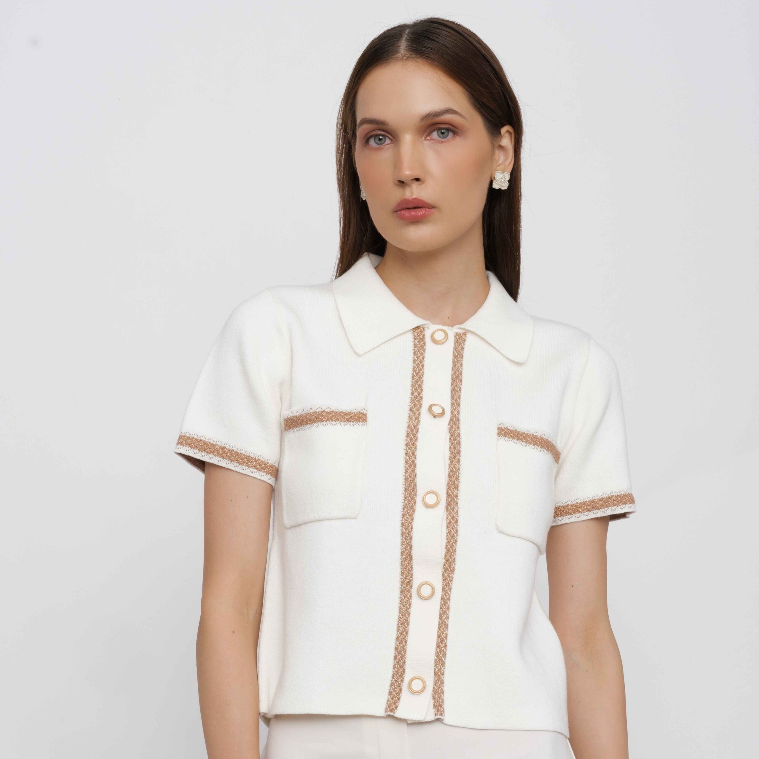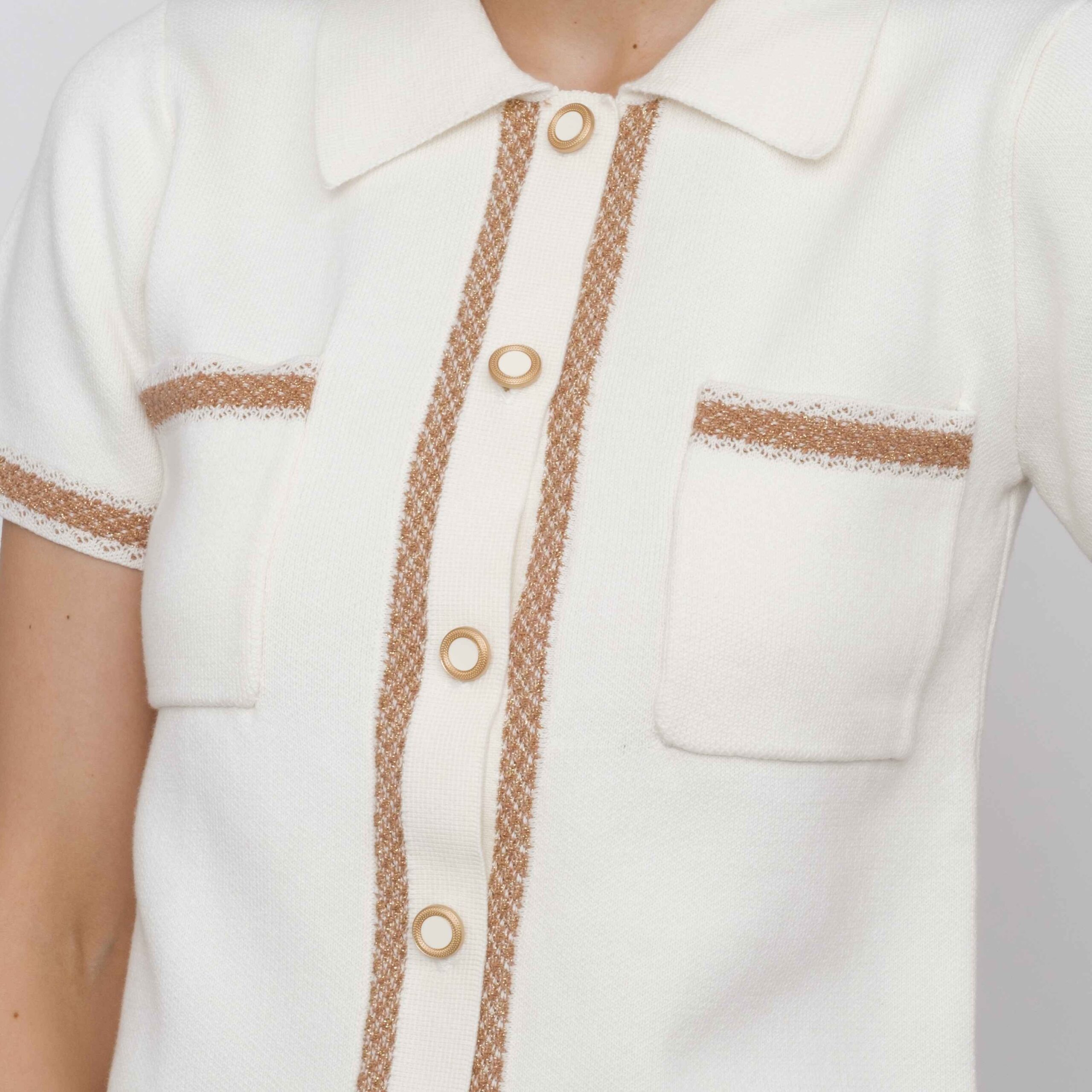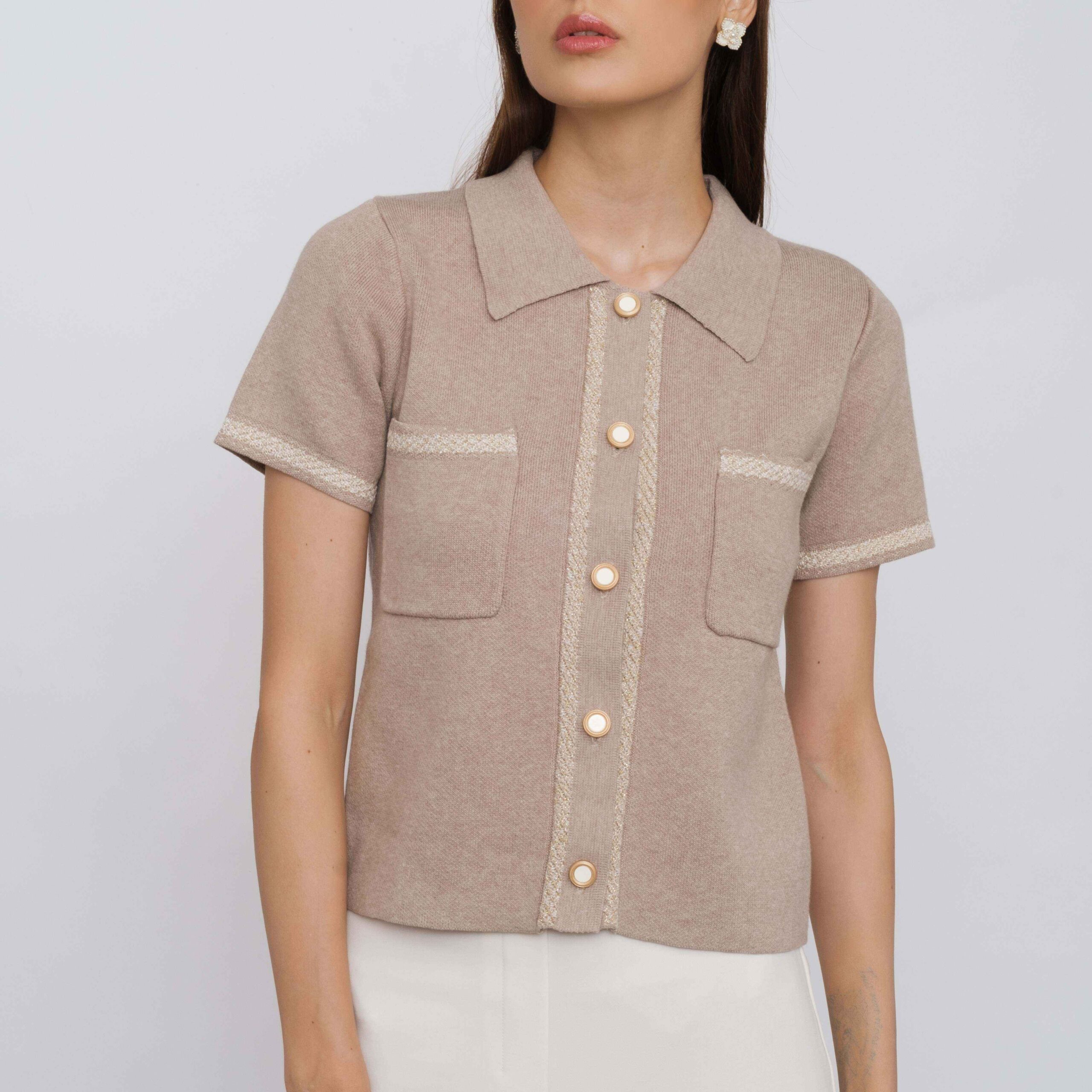 A perfect blend of style and comfort for daily wear, featuring a chic detailed collar, a functional pocket with elegant gold accents, and unique buttons