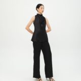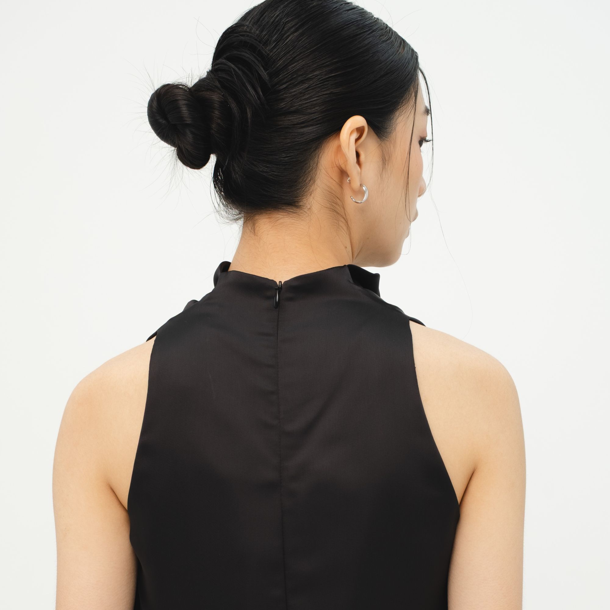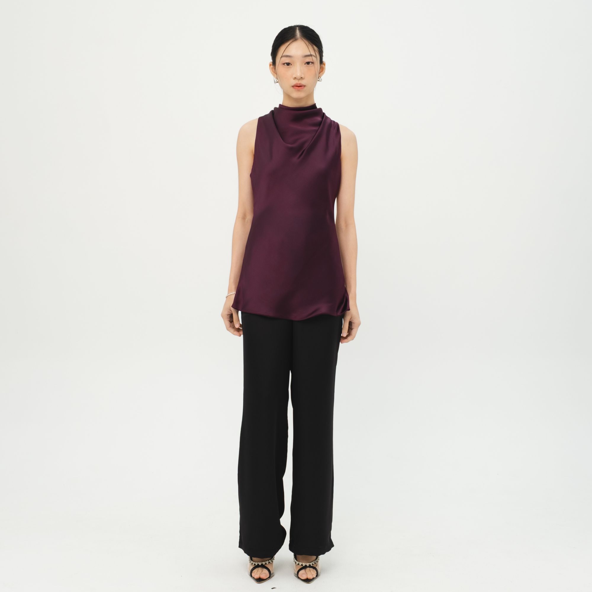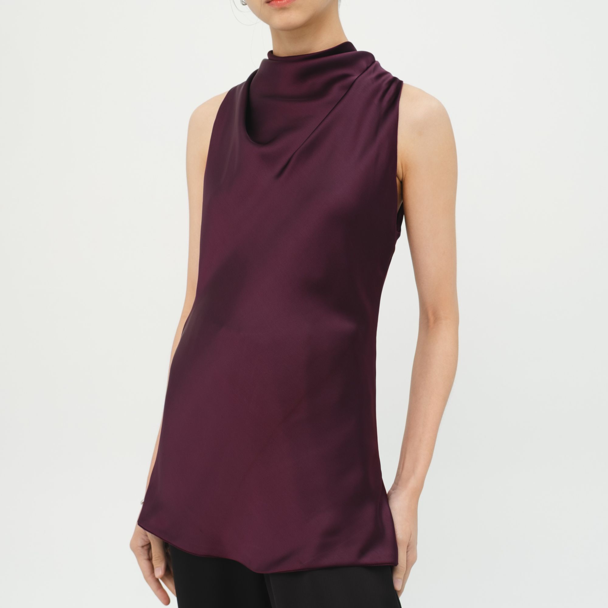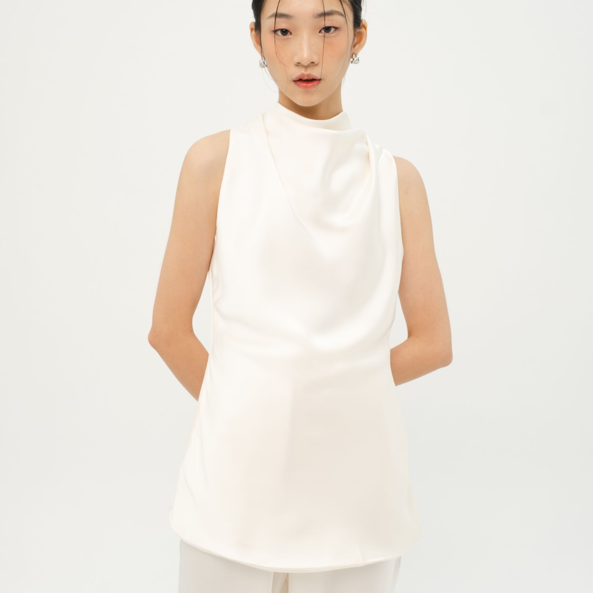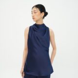 Sleeveless halter-neck top with a gracefully draped front. Made from luxurious satin, it’s the kind of piece that adds effortless shine to any occasion.