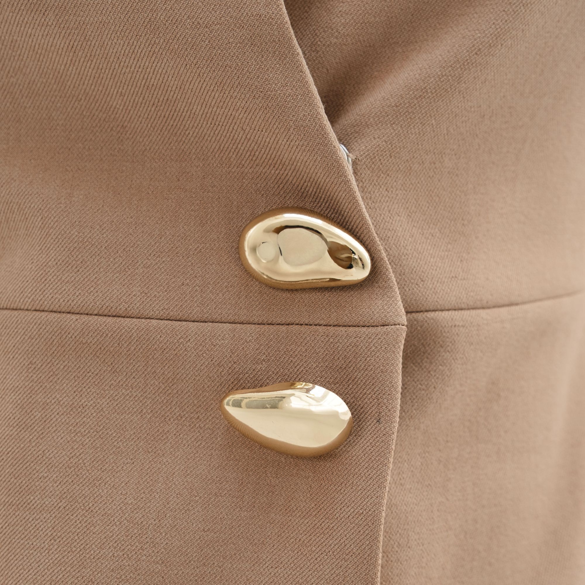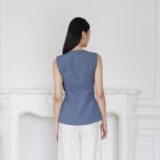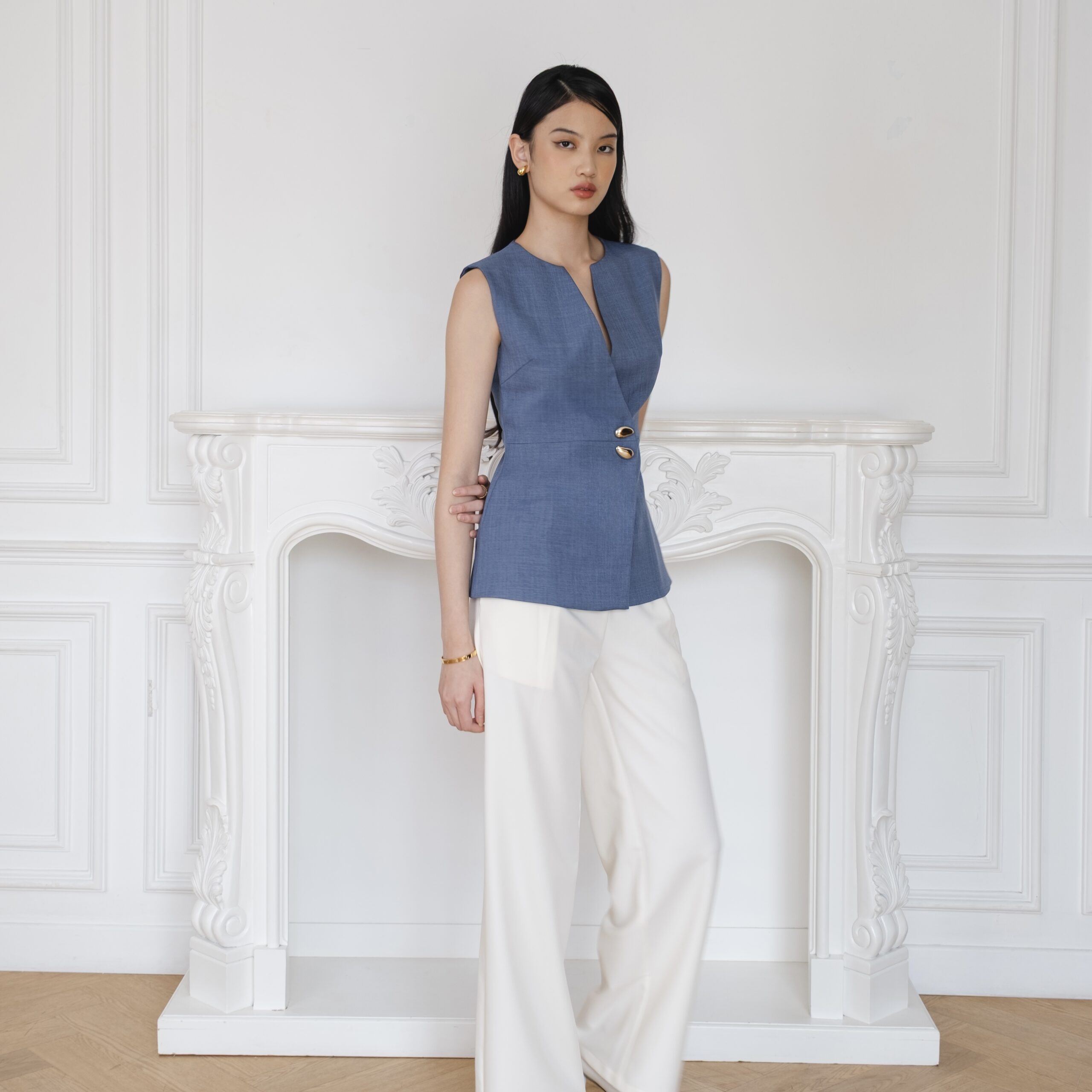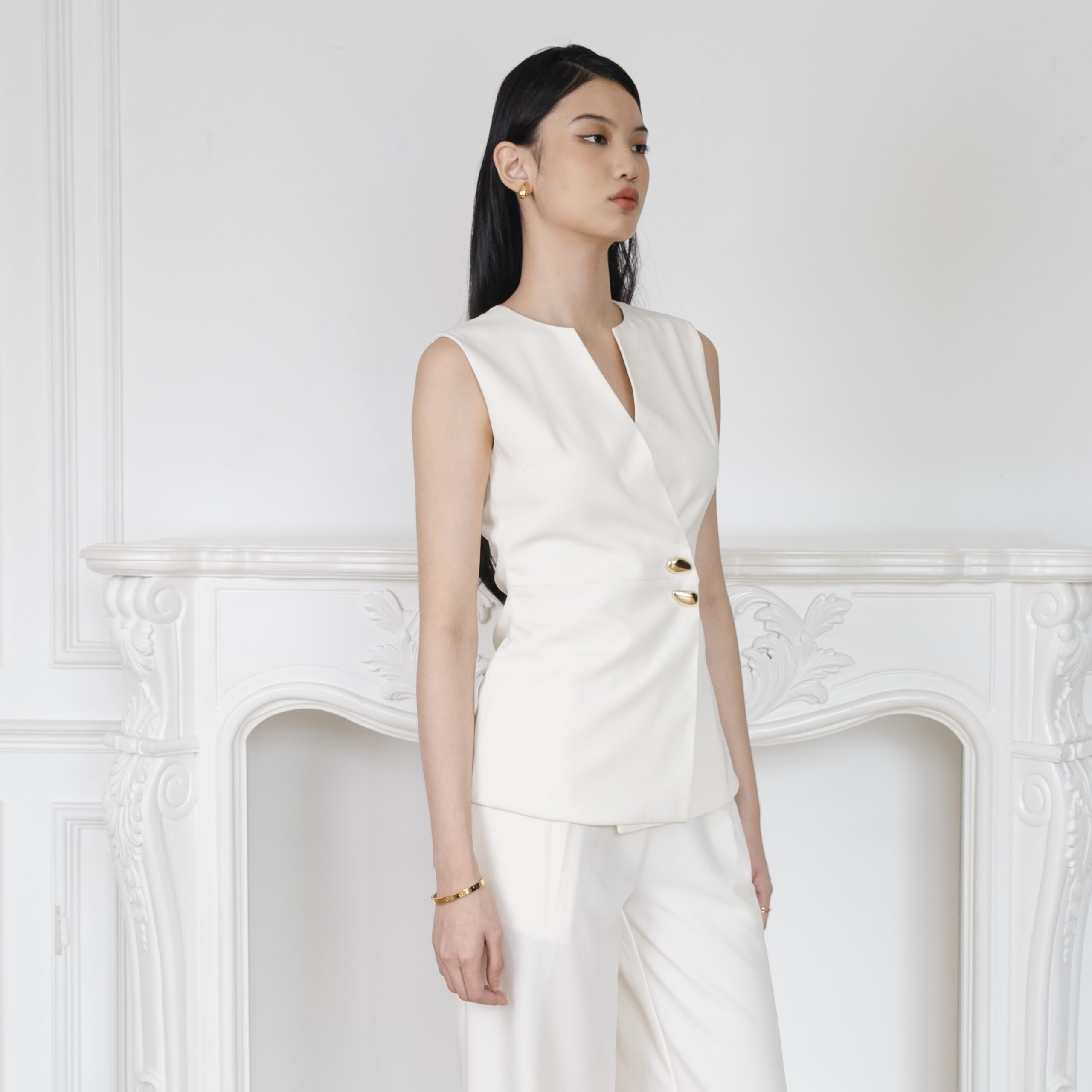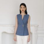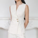 Sleek and structured, this vest stands out with its asymmetric front and sculptural gold buttons. It’s an easy piece to mix into daily looks for a polished finish