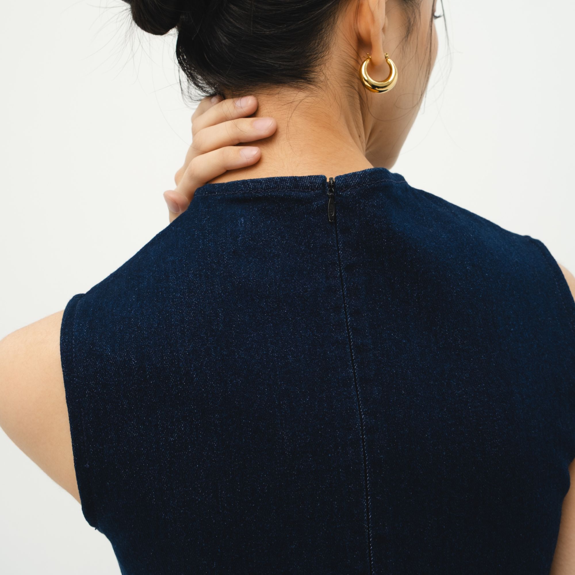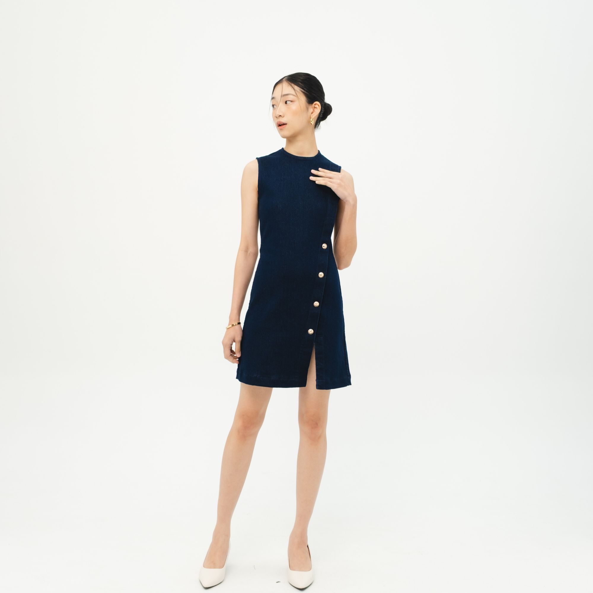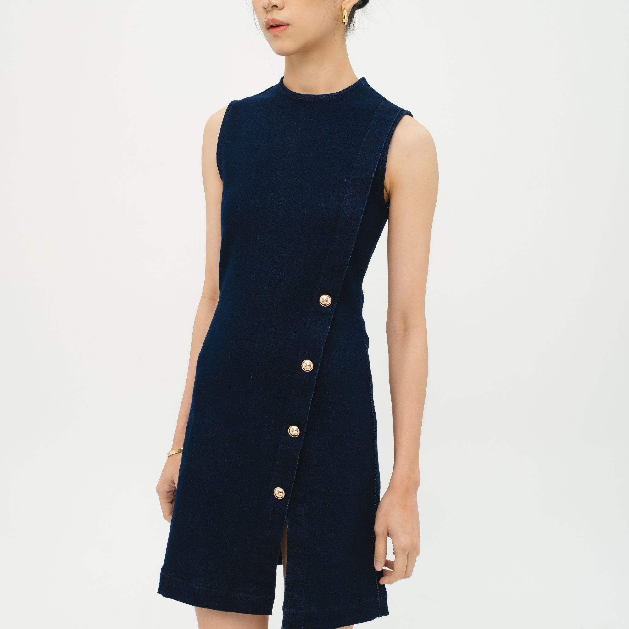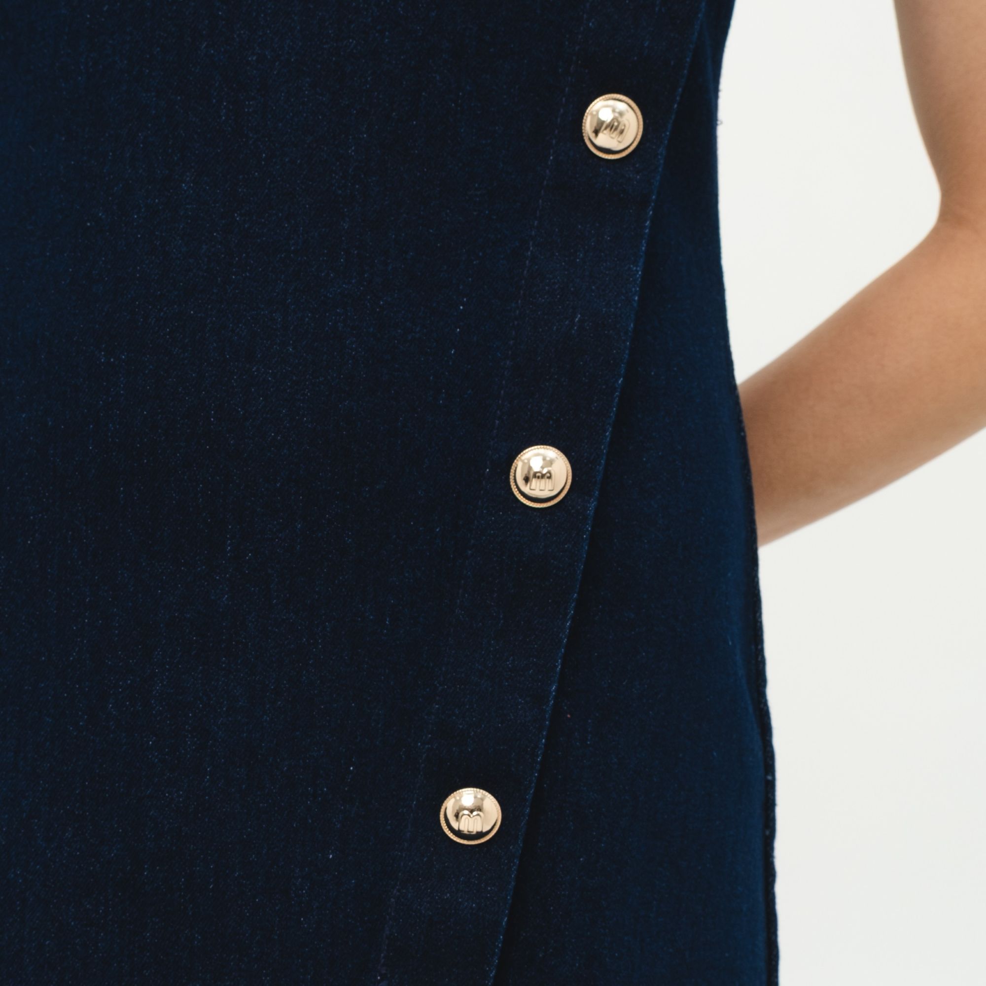 Sleeveless dress with a flattering front slit and gold buttons featuring the Maja logo. The stretchy denim keeps it cool and comfortable while still looking elegant.