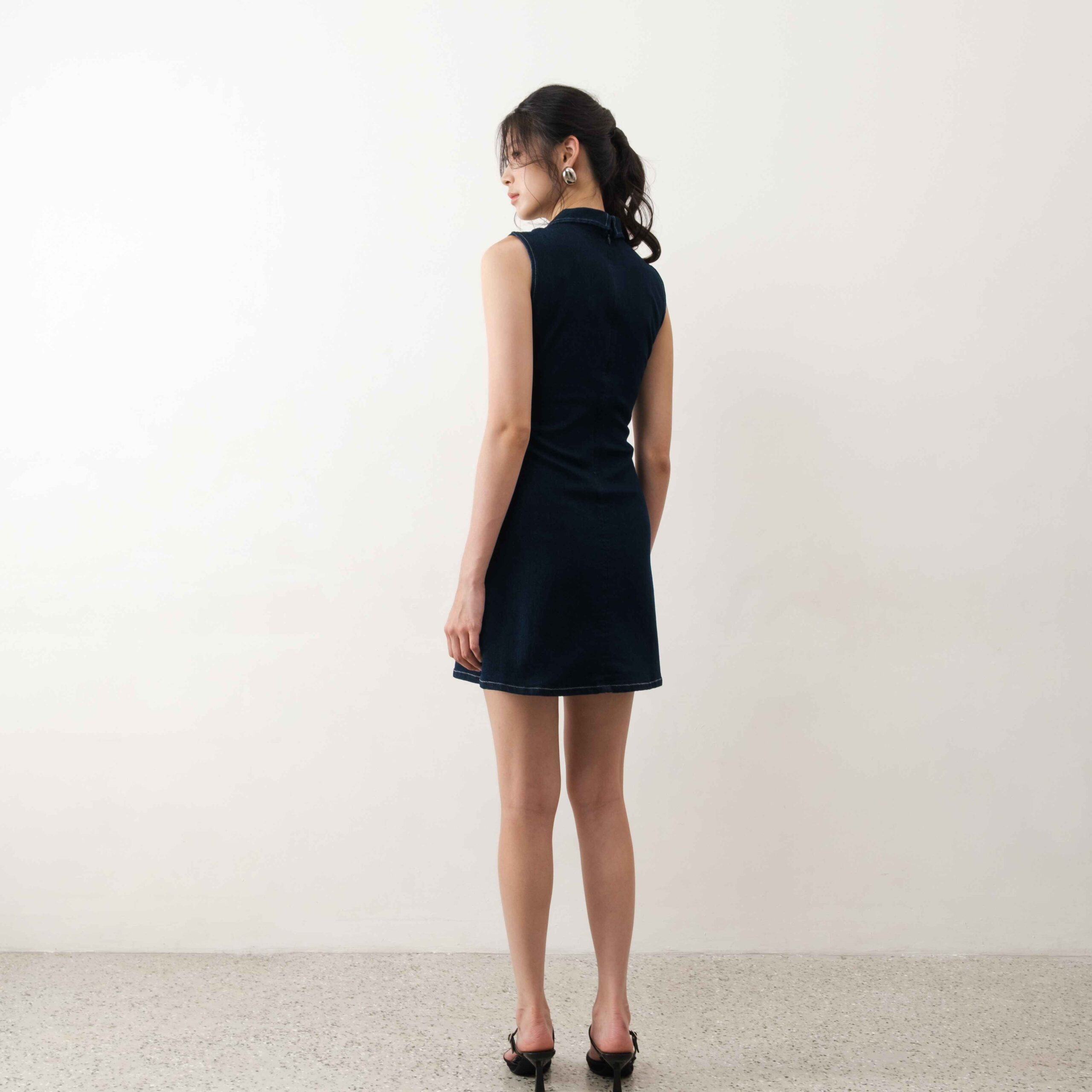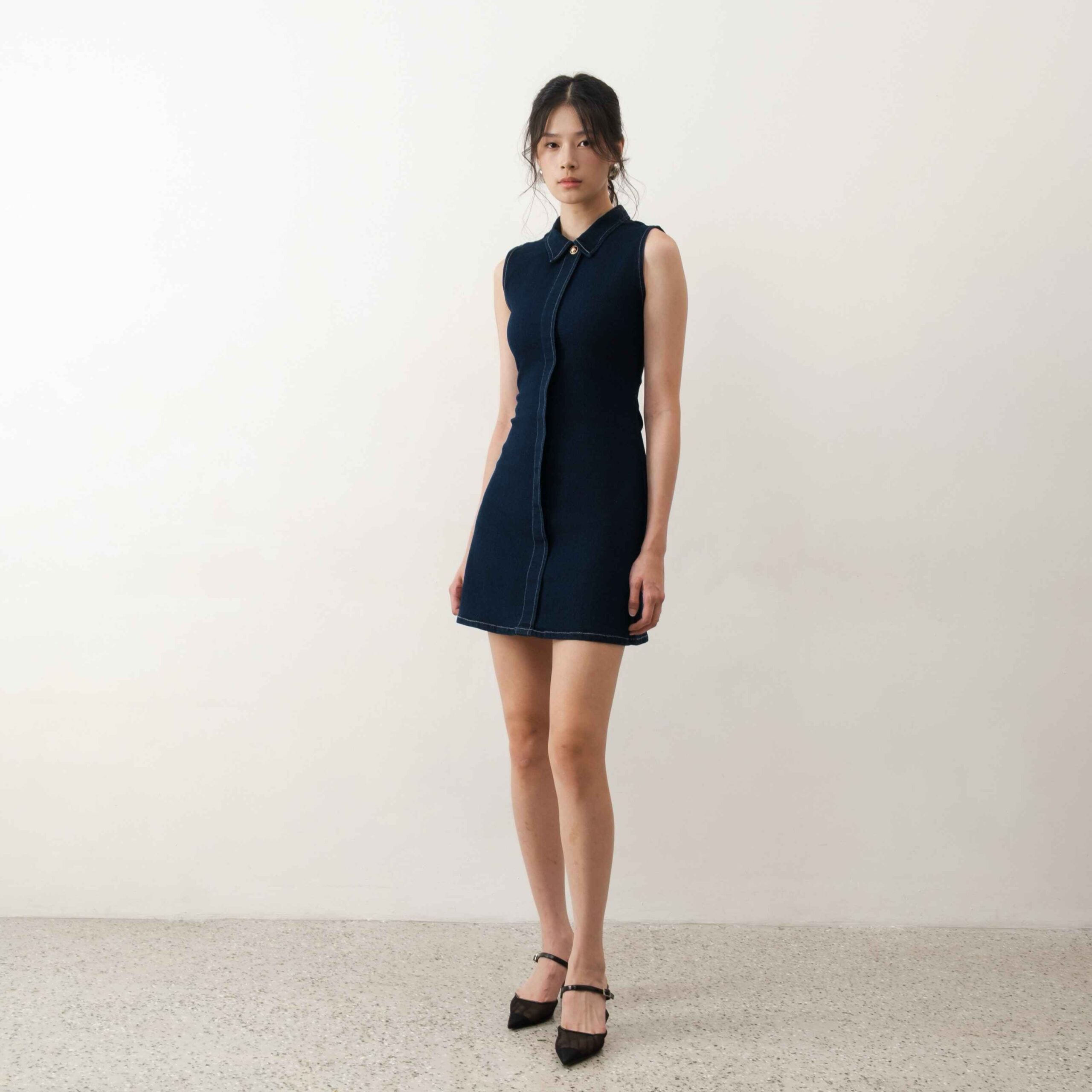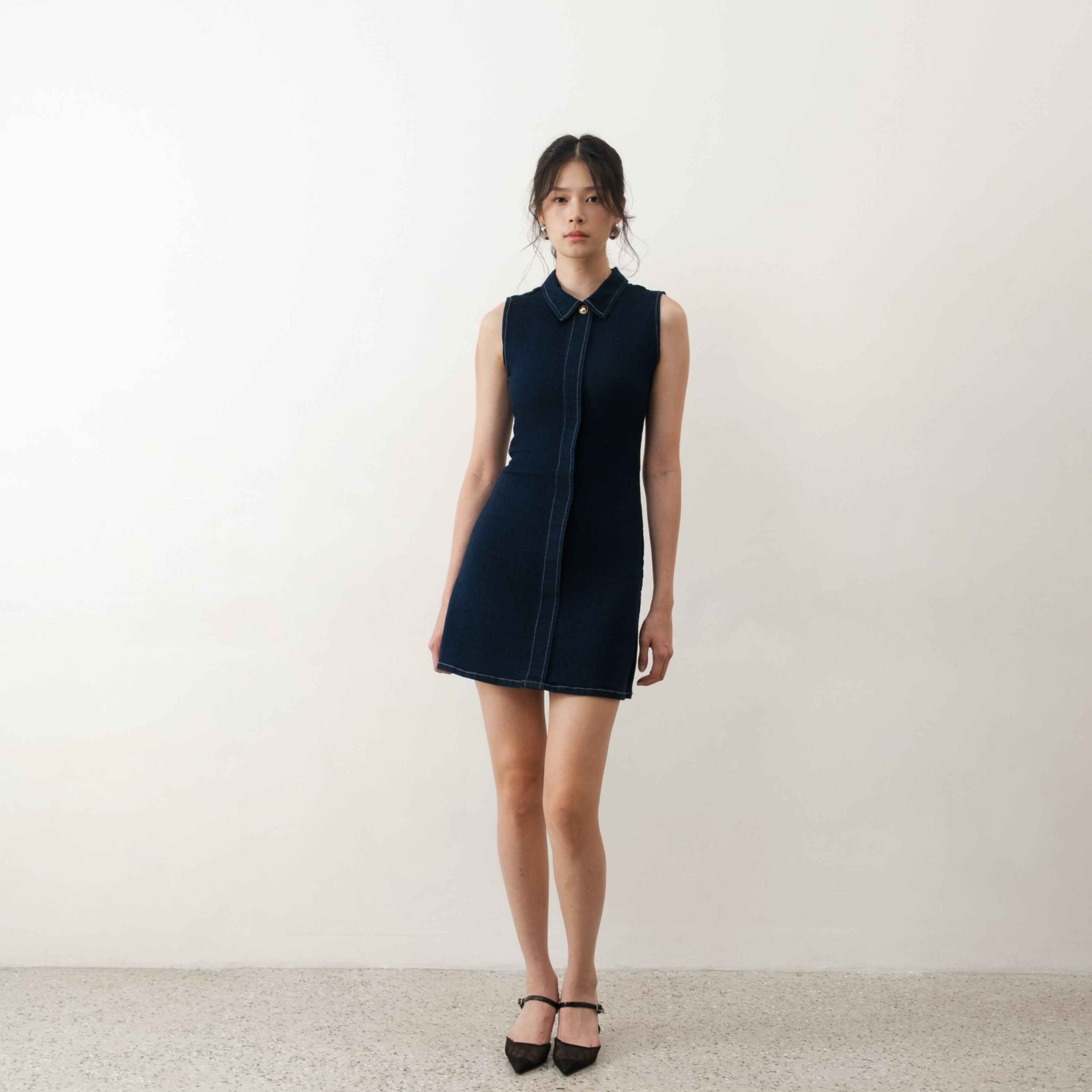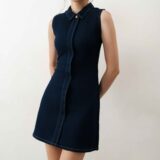 Designed in deep blue denim, this dress features a classic design with a collared neckline,gold button, and back zipper. A perfect pick for a casual brunch or an evening out.