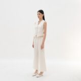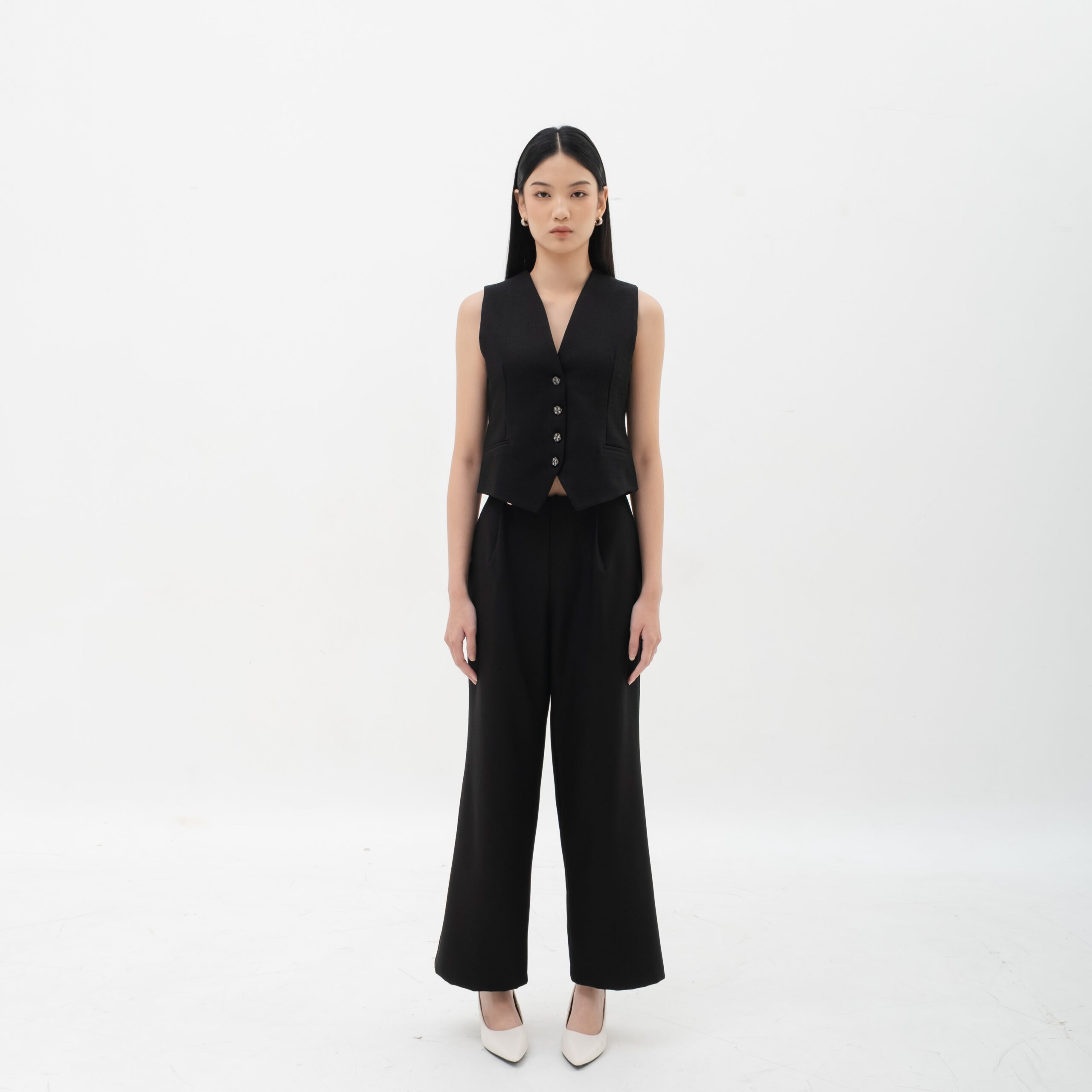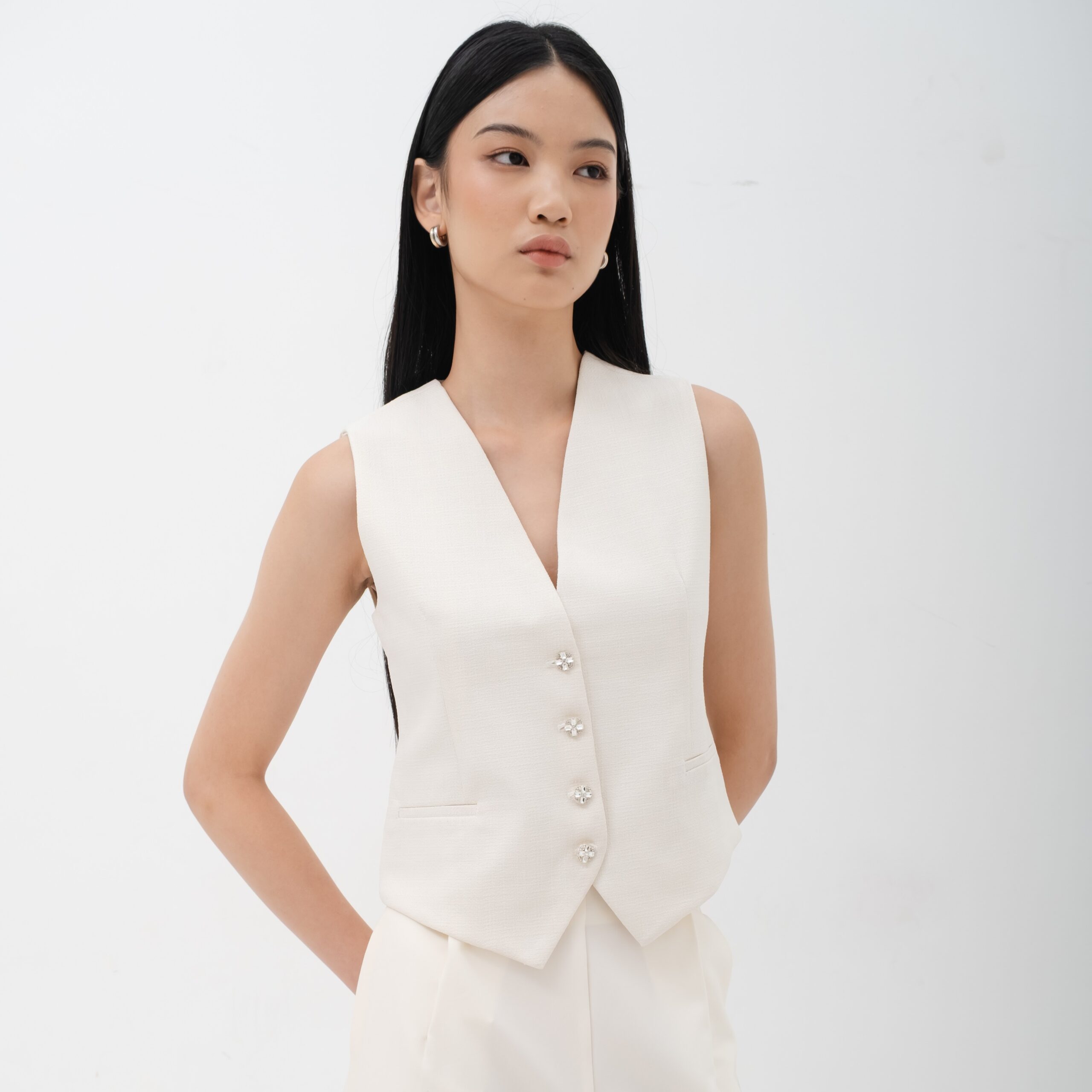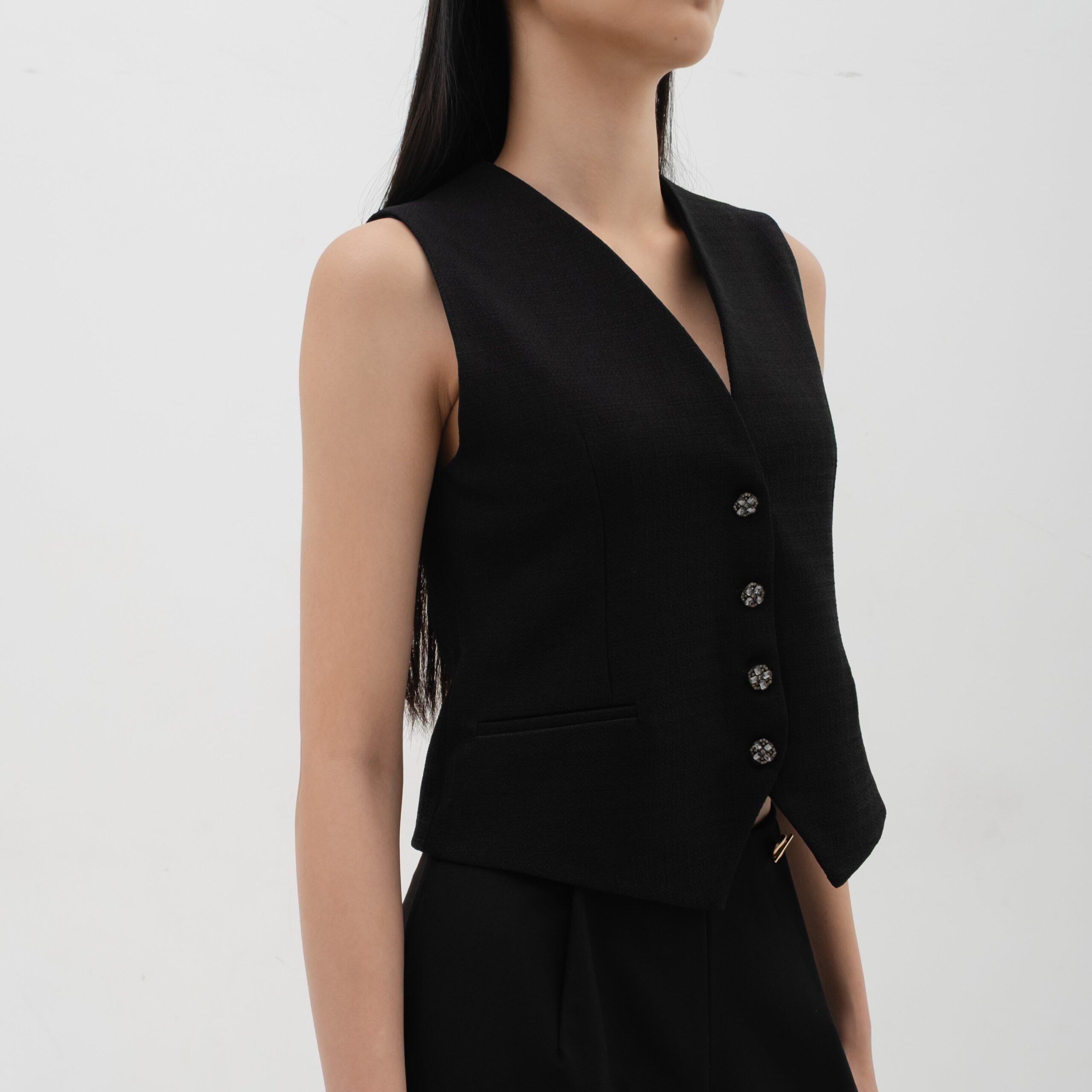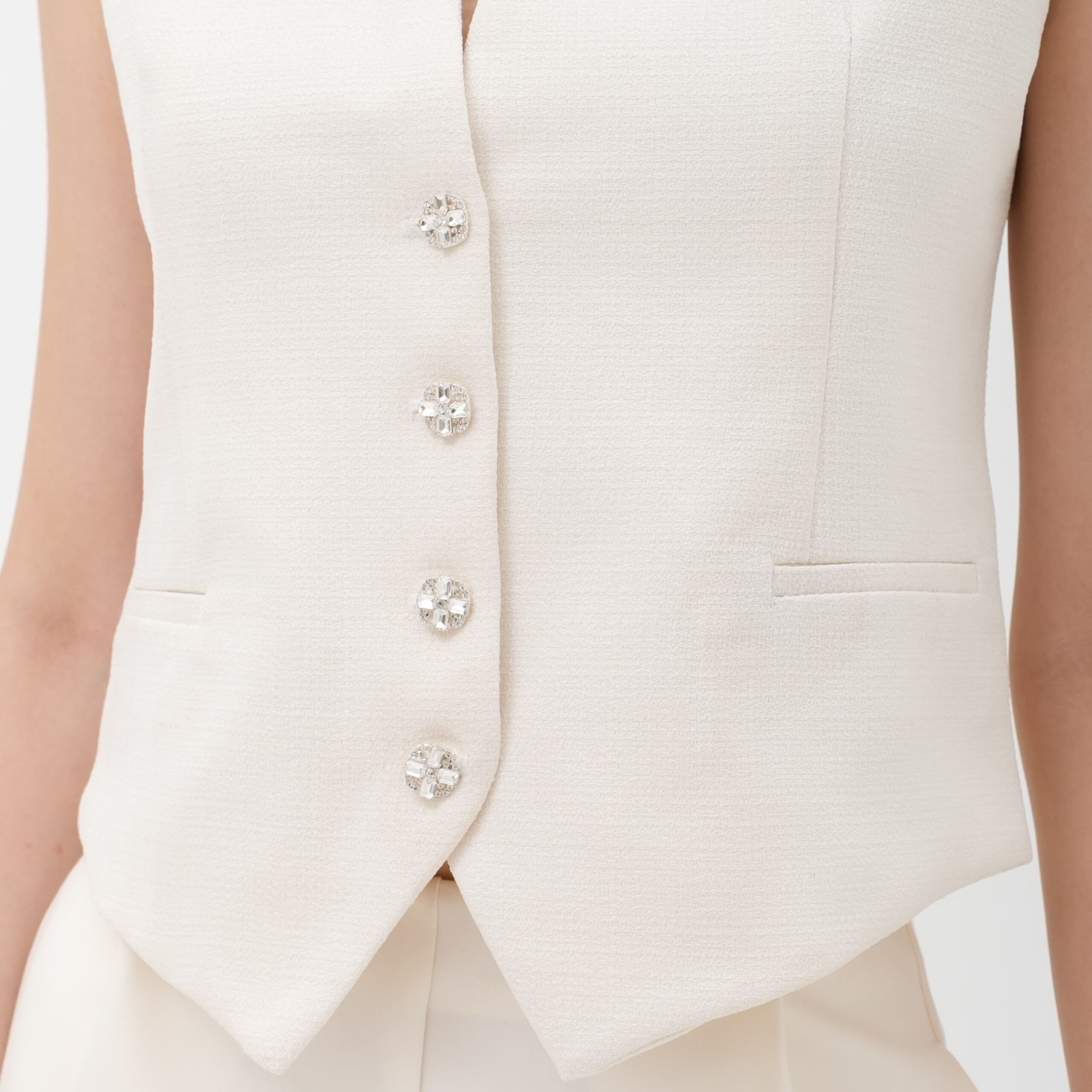 A tailored sleeveless vest with a flattering V-neckline. It’s finished with jewel-like buttons for a polished, standout look.