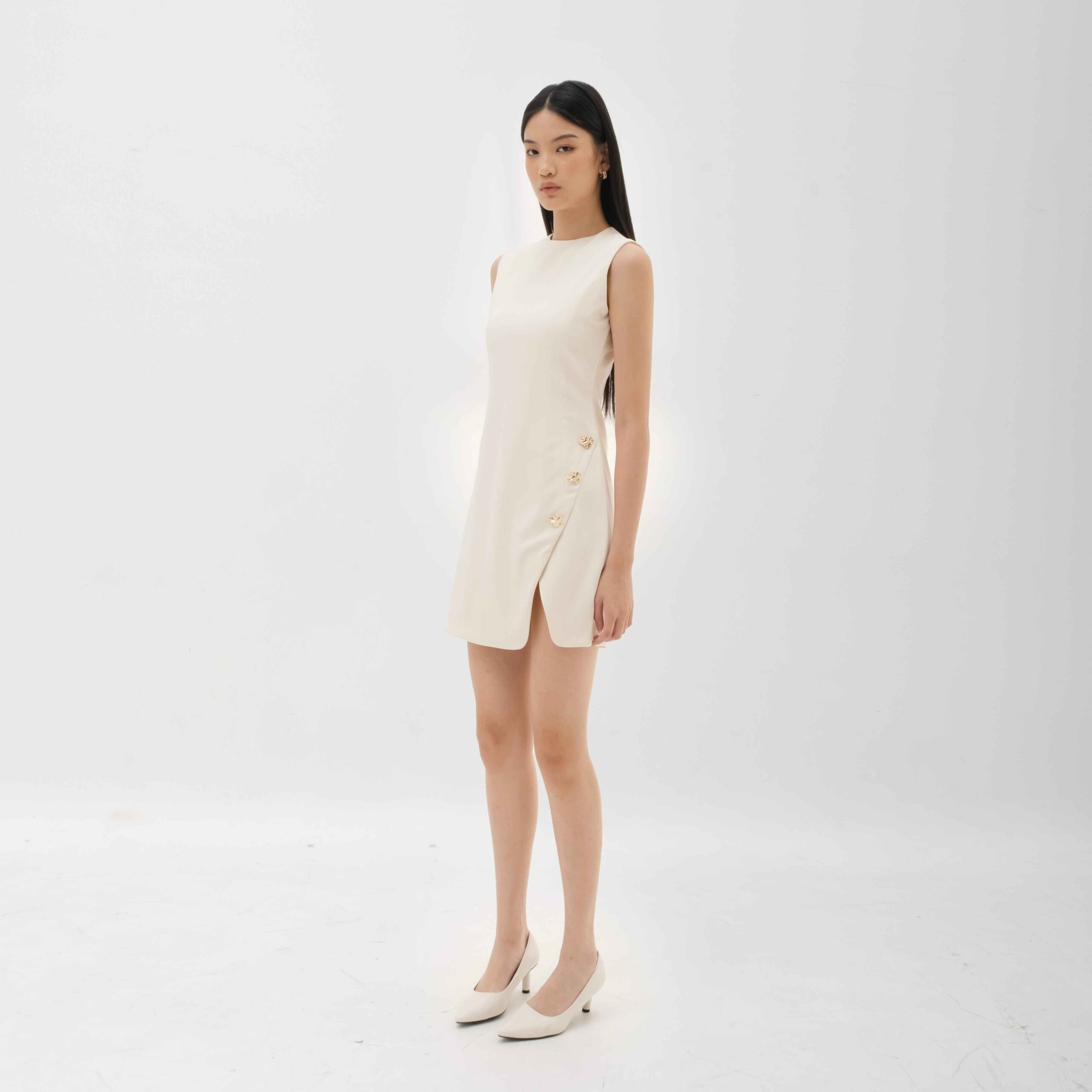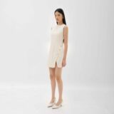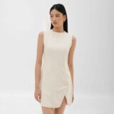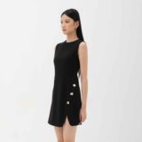 A curve-hugging mini dress with a sleek silhouette, a side slit, and gold accents that add just the right touch of elegance.